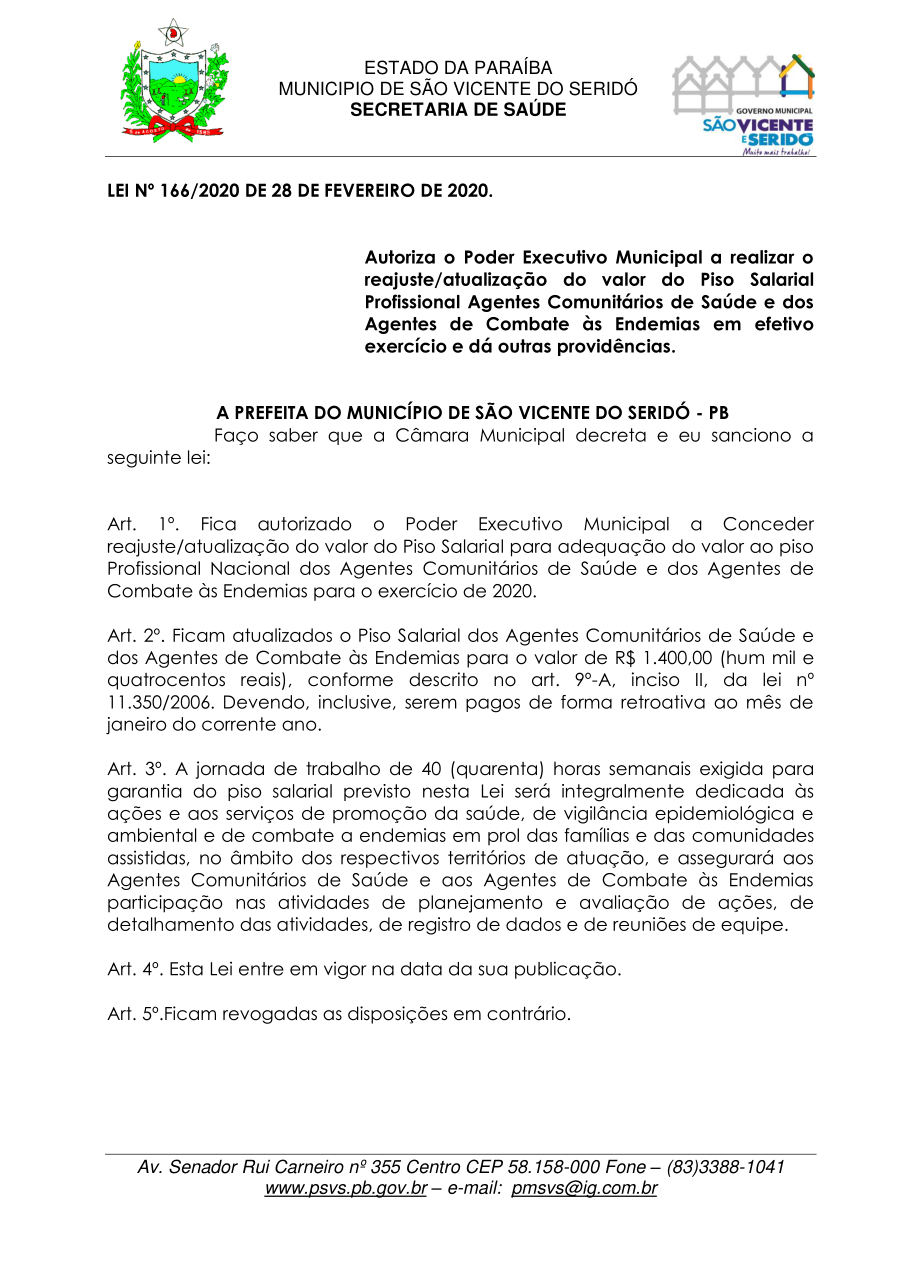 LEI 166/2020 - Autoriza o Poder Executivo Municipal a realizar o reajuste/atualização do valor do Piso Salarial Profissional Agentes Comunitários de Saúde e dos Agentes de Combate às Endemias em efetivo exercício e dá outras providências.