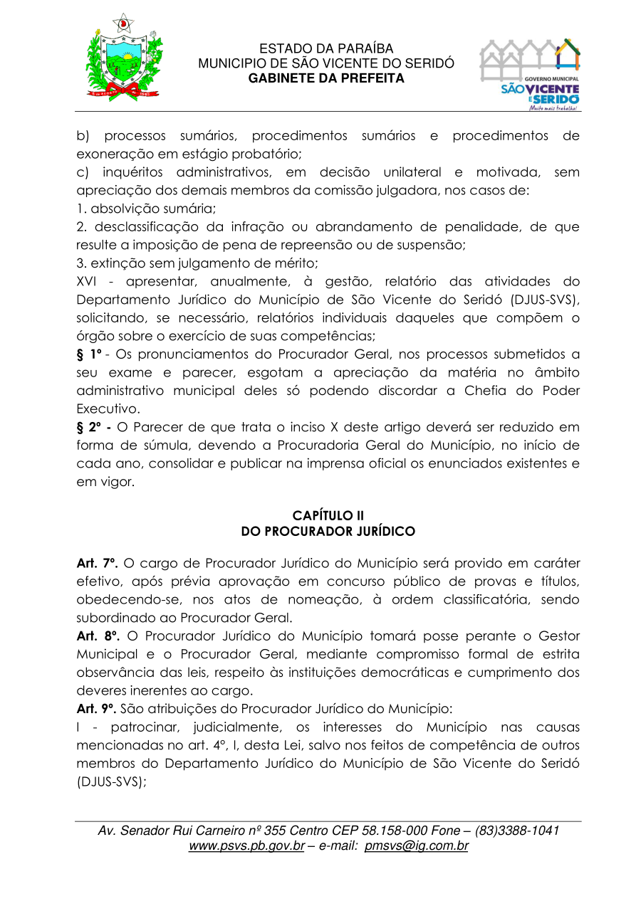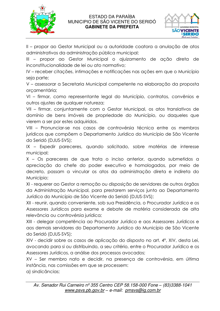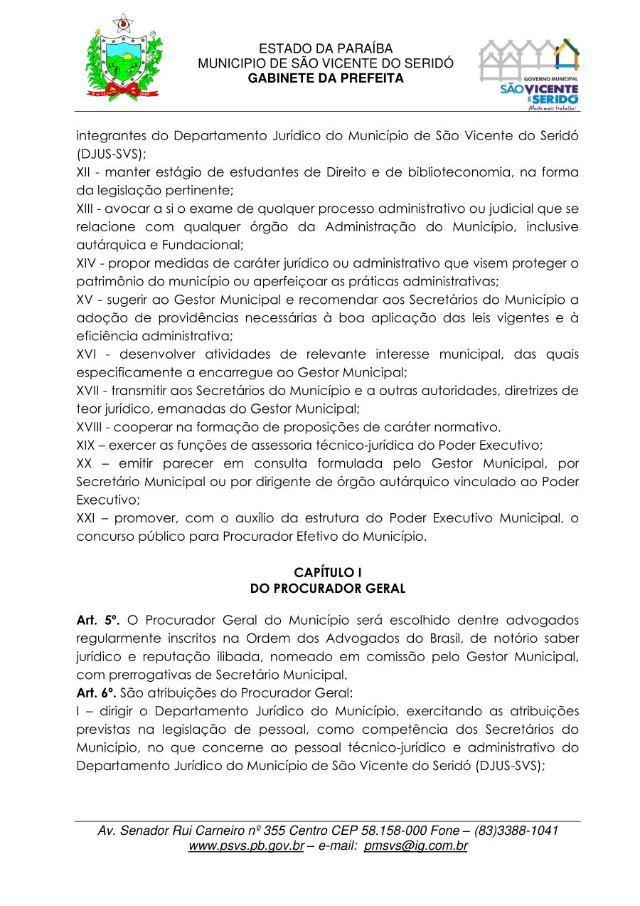 LEI 161/2019 - Dispõe sobre o Departamento Jurídico do Município de São Vicente do Seridó (DJUSSVS) e dá outras providências.
