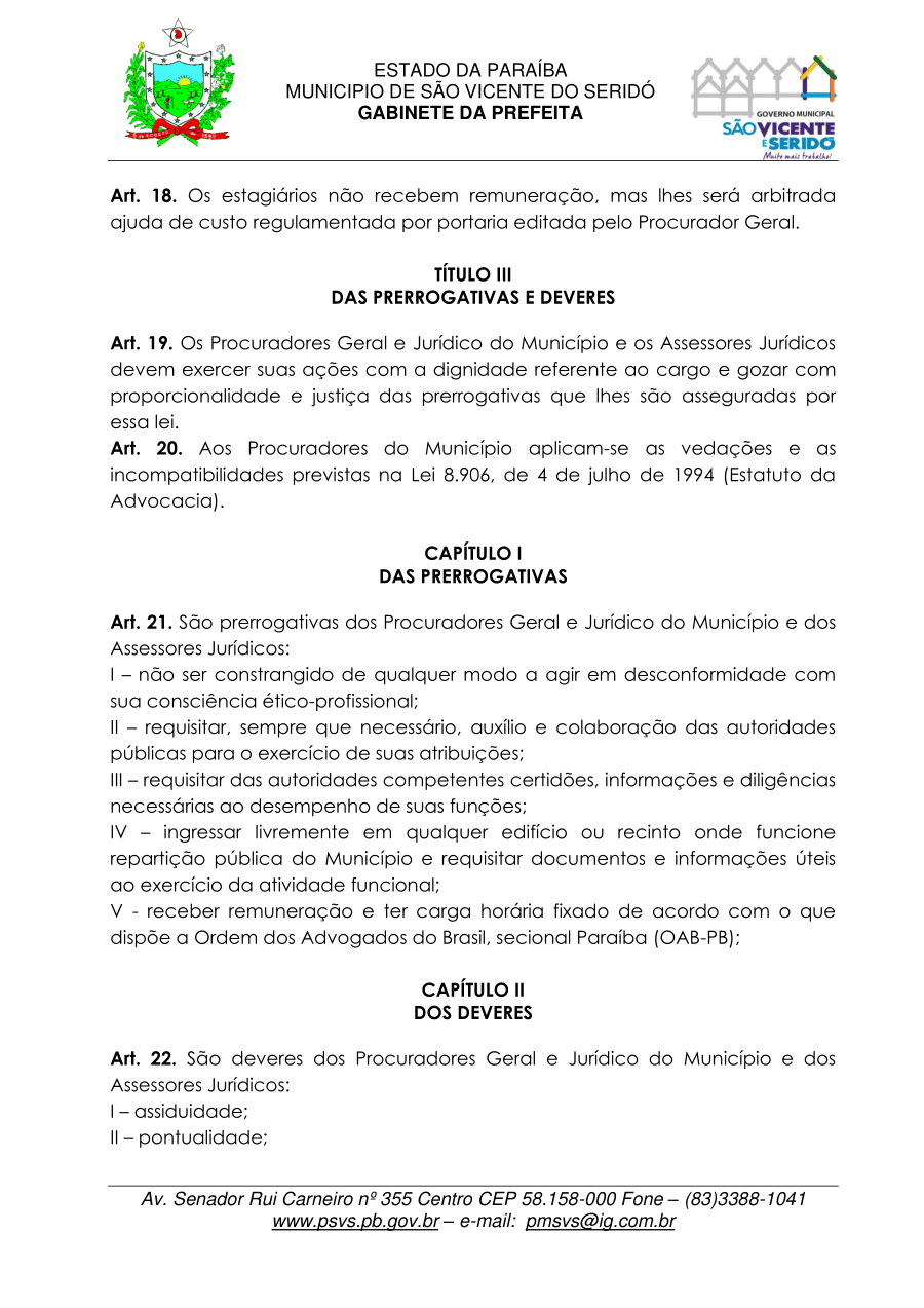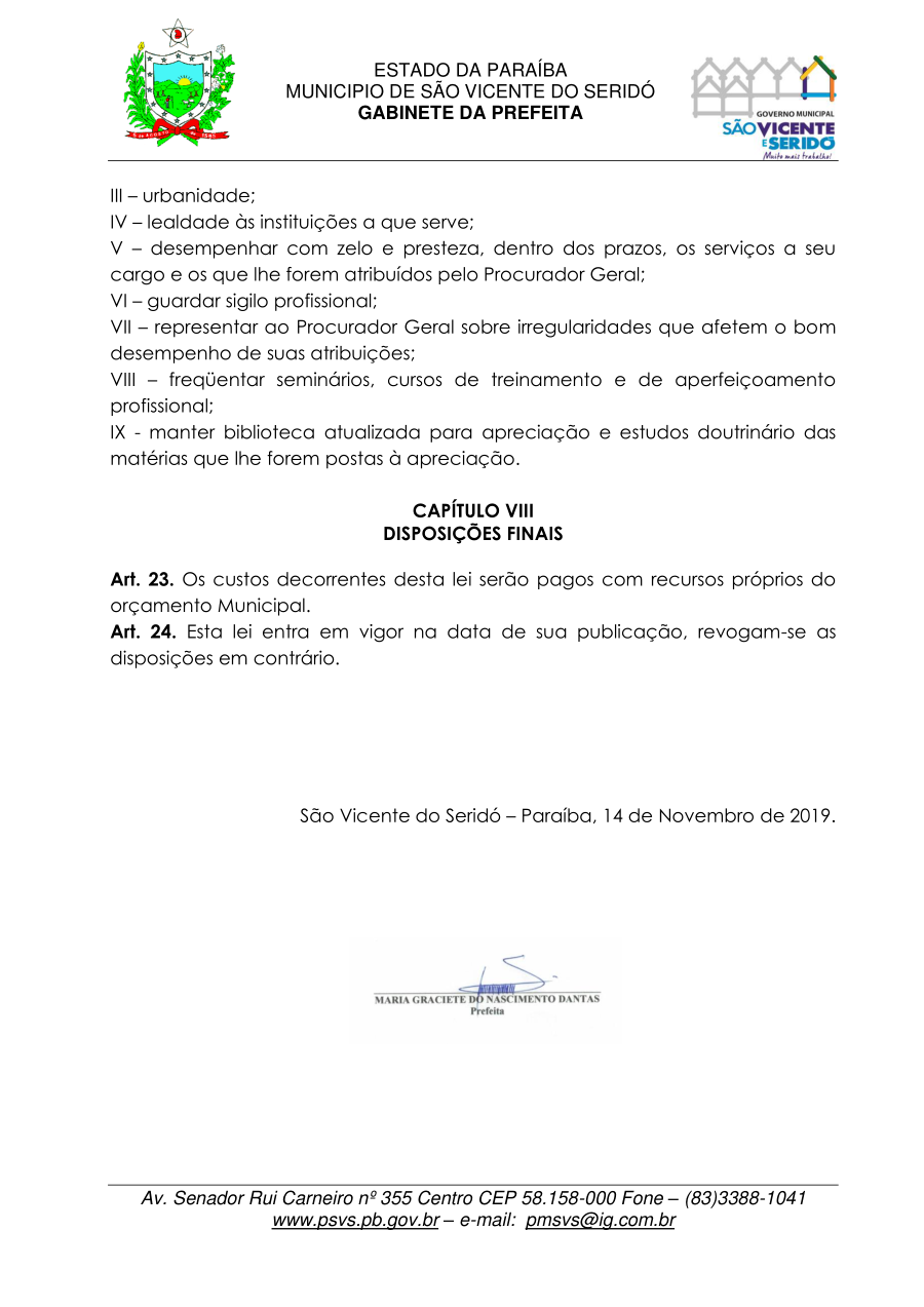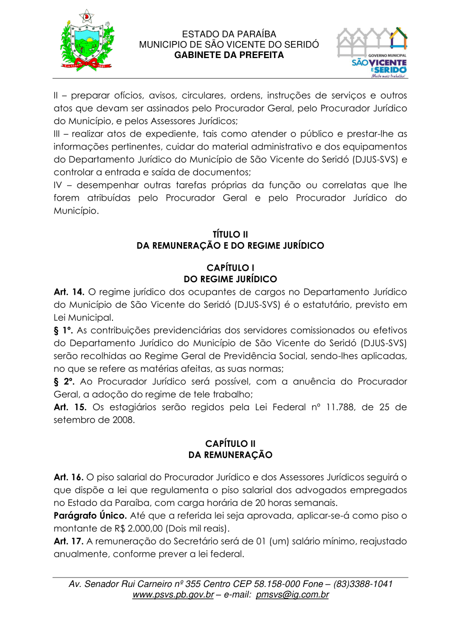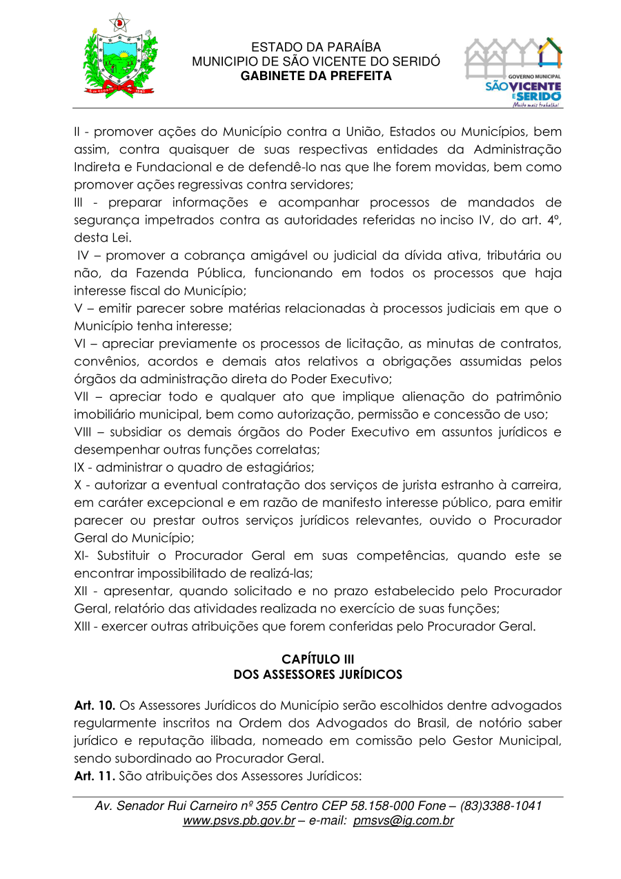 LEI 161/2019 - Dispõe sobre o Departamento Jurídico do Município de São Vicente do Seridó (DJUSSVS) e dá outras providências.