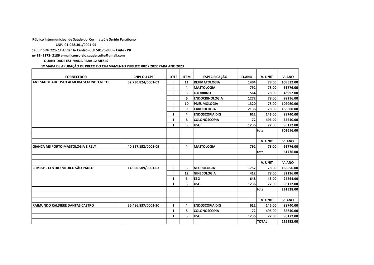 1° MAPA DE APURAÇÃO DE PREÇO DO CHAMAMENTO PÚBLICO 0002/2022 PARA ANO 2023