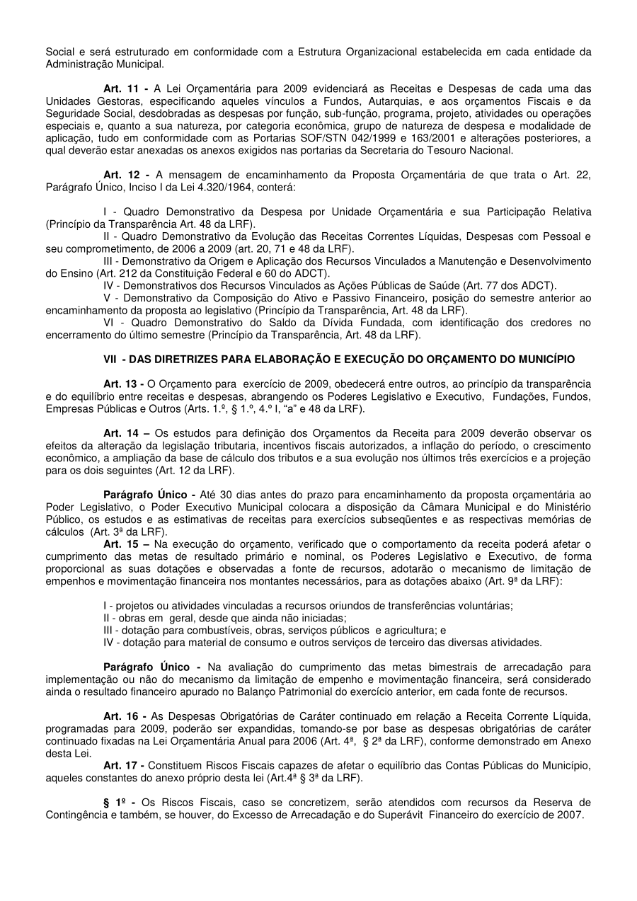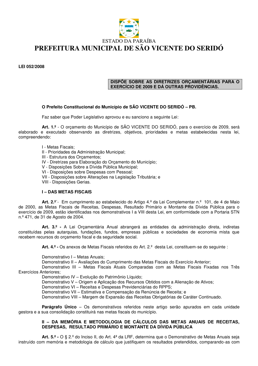 LEI 052/2008 - DISPÕE SOBRE AS DIRETRIZES ORÇAMENTÁRIAS PARA O EXERCÍCIO DE 2009 E DÁ OUTRAS PROVIDÊNCIAS.