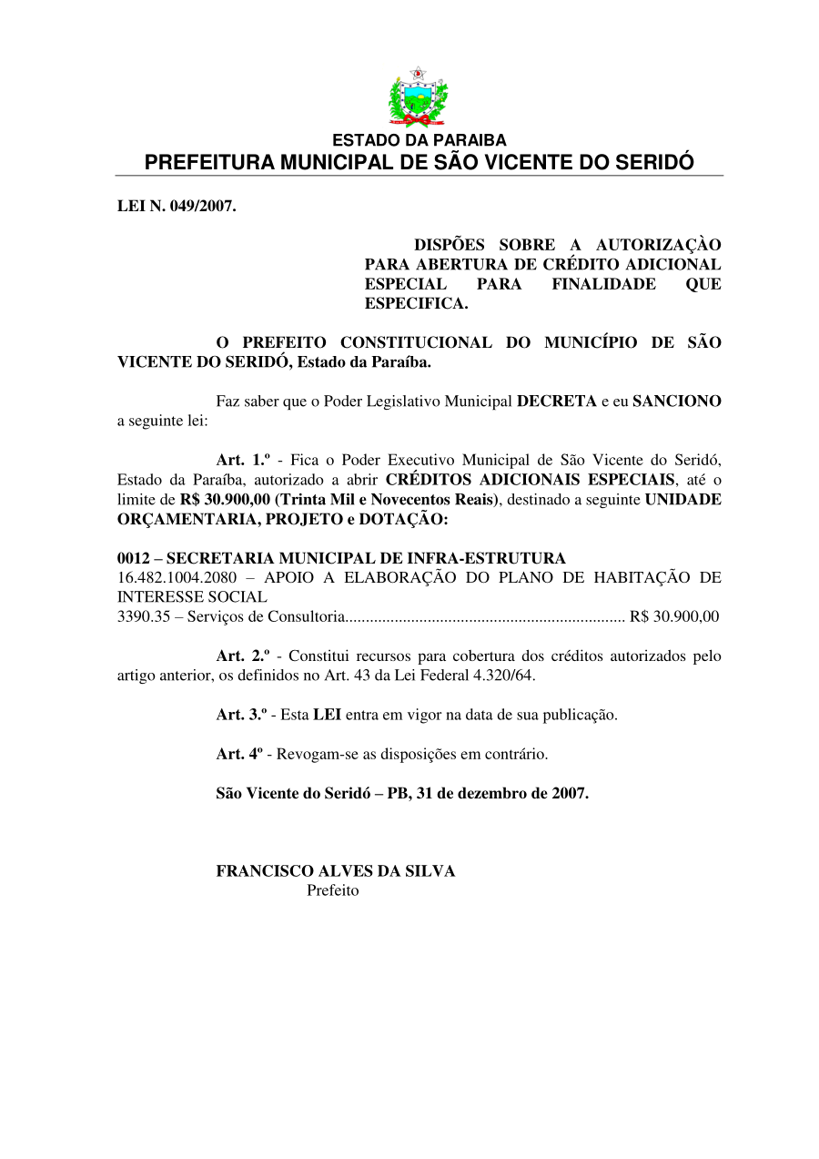 LEI 049/2007 - DISPÕES SOBRE A AUTORIZAÇÀO PARA ABERTURA DE CRÉDITO ADICIONAL ESPECIAL PARA FINALIDADE QUE ESPECIFICA.