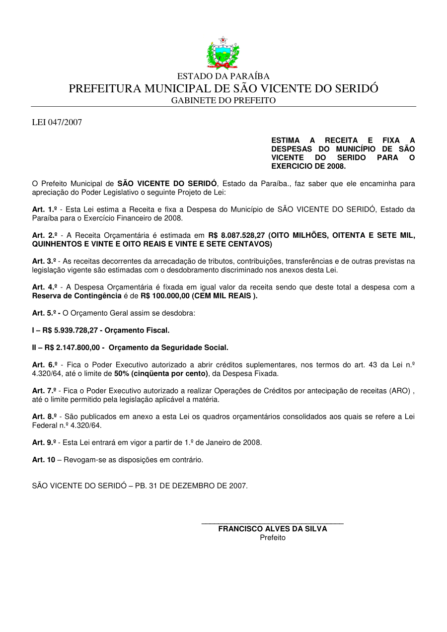 LEI 047/2007 - ESTIMA A RECEITA E FIXA A DESPESAS DO MUNICÍPIO DE SÃO VICENTE DO SERIDO PARA O EXERCICIO DE 2008.