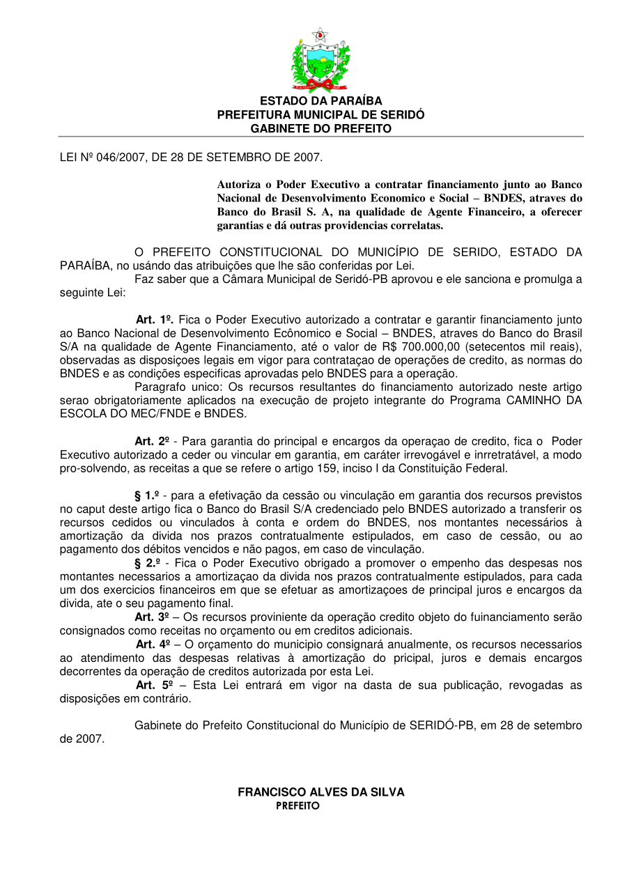 LEI 046/2007 - Autoriza o Poder Executivo a contratar financiamento junto ao Banco Nacional de Desenvolvimento Economico e Social – BNDES, atraves do Banco do Brasil S. A, na qualidade de Agente Financeiro, a oferecer garantias e dá outras providencias correlatas.