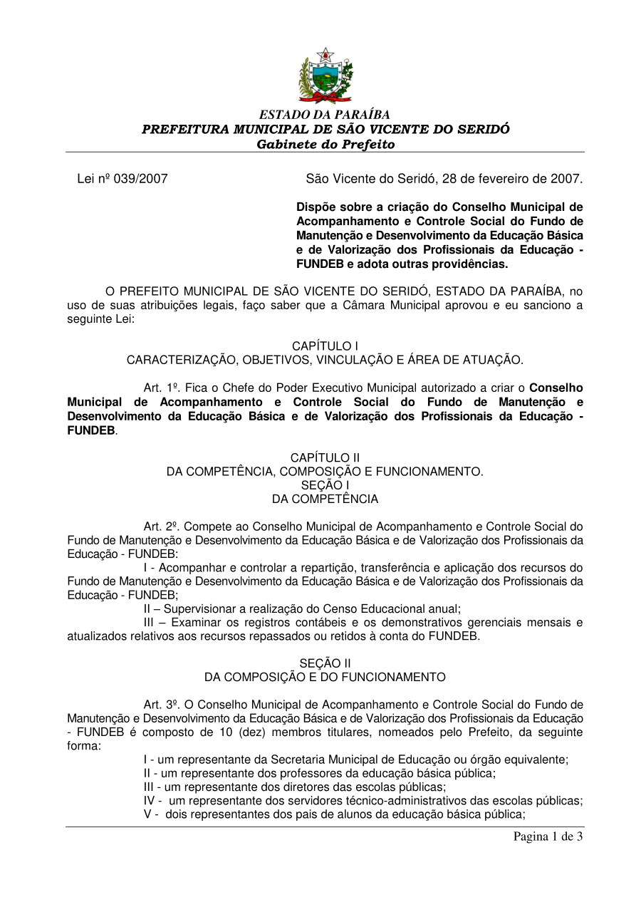 LEI 039/2007 - Dispõe sobre a criação do Conselho Municipal de Acompanhamento e Controle Social do Fundo de Manutenção e Desenvolvimento da Educação Básica e de Valorização dos Profissionais da Educação - FUNDEB e adota outras providências.