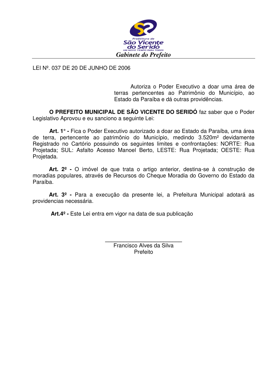 LEI 037/2006 - Autoriza o Poder Executivo a doar uma área de terras pertencentes ao Patrimônio do Município, ao Estado da Paraíba e dá outras providências.