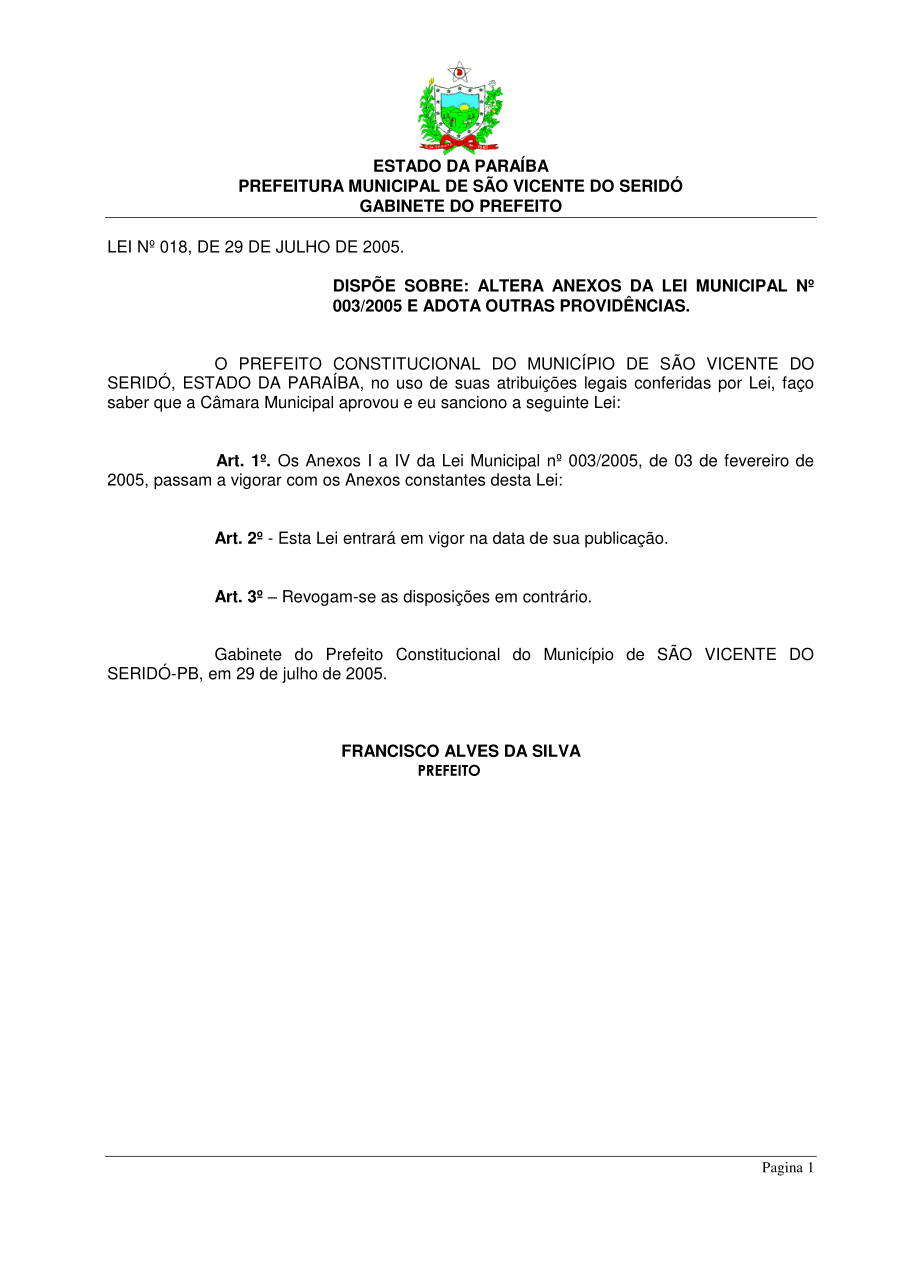 LEI 018/2005 - DISPÕE SOBRE: ALTERA ANEXOS DA LEI MUNICIPAL Nº 003/2005 E ADOTA OUTRAS PROVIDÊNCIAS.