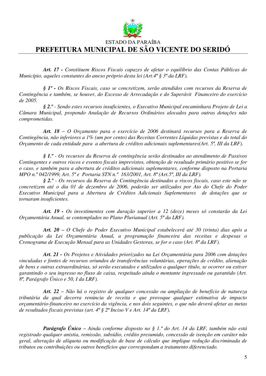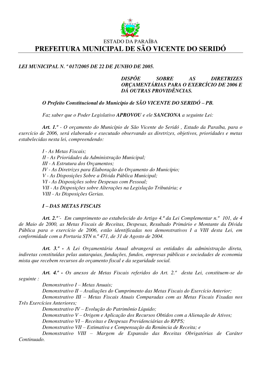 LEI 017/2005 - DISPÕE SOBRE AS DIRETRIZES ORÇAMENTÁRIAS PARA O EXERCÍCIO DE 2006 E DÁ OUTRAS PROVIDÊNCIAS.