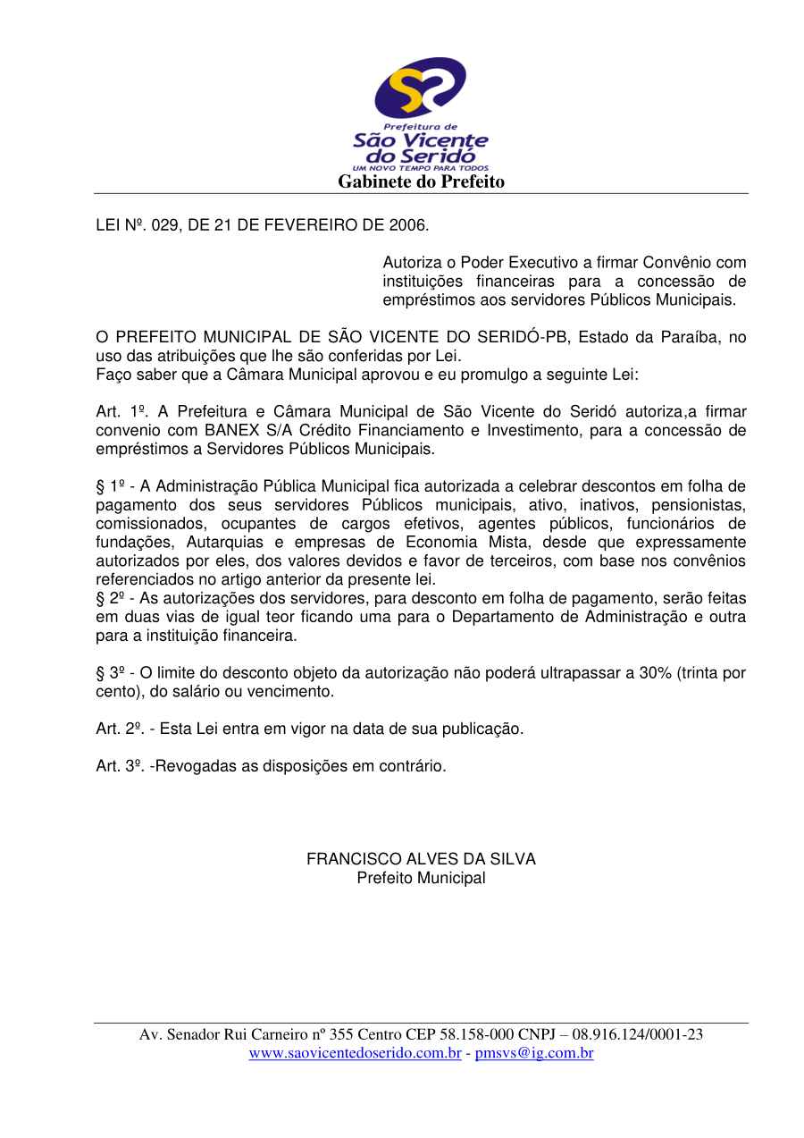 LEI 029/2006 - Autoriza o Poder Executivo a firmar Convênio com instituições financeiras para a concessão de empréstimos aos servidores Públicos Municipais.