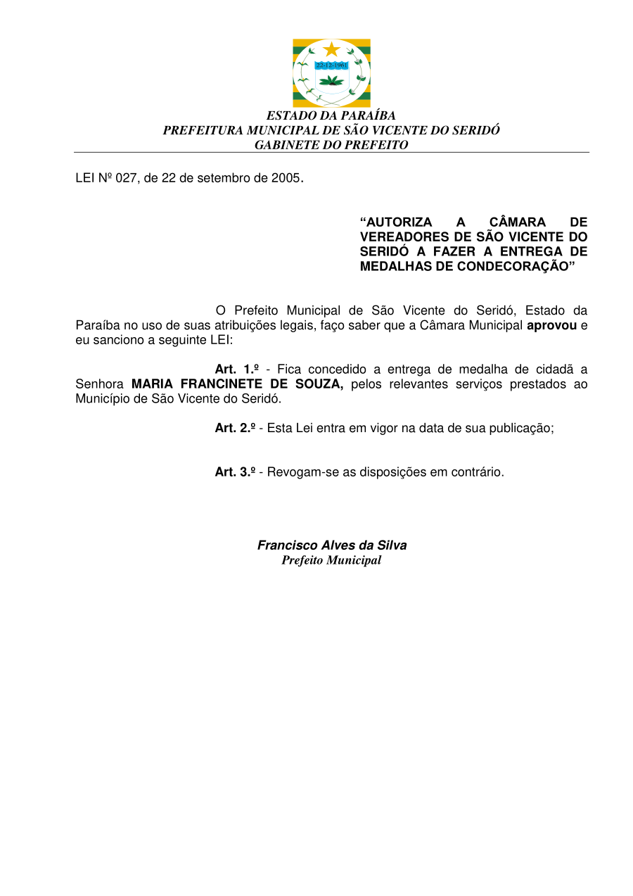 LEI 027/2005 - “AUTORIZA A CÂMARA DE VEREADORES DE SÃO VICENTE DO SERIDÓ A FAZER A ENTREGA DE MEDALHAS DE CONDECORAÇÃO”