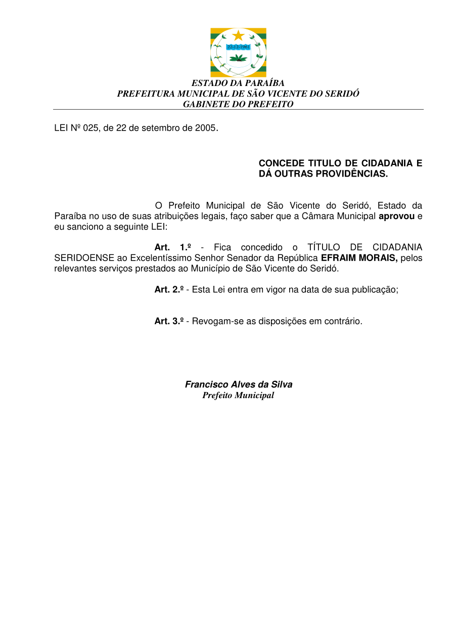 LEI 025/2005 - CONCEDE TITULO DE CIDADANIA E DÁ OUTRAS PROVIDÊNCIAS.