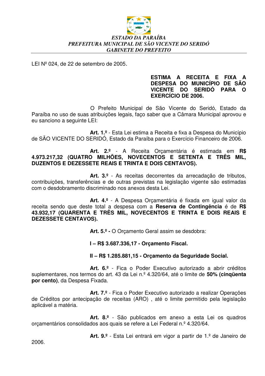 LEI 024/2005 - ESTIMA A RECEITA E FIXA A DESPESA DO MUNICÍPIO DE SÃO VICENTE DO SERIDÓ PARA O EXERCÍCIO DE 2006.