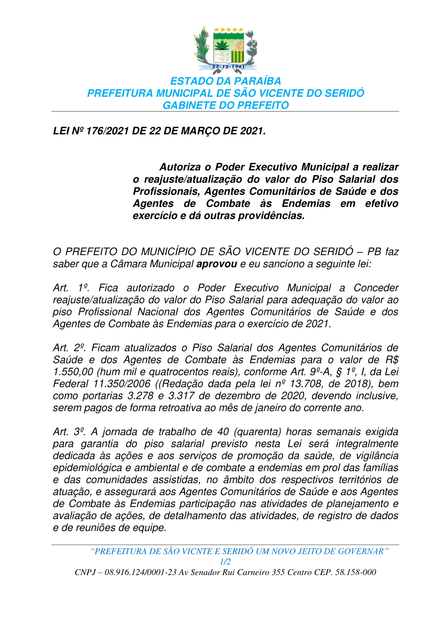 LEI 176/2021 - AUTORIZA O PODER EXECUTIVO MUNICIPAL A REALIZAR O REAJUSTE/ATUALIZAÇÃO DO VALOR DO PISO SALARIAL DOS PROFISSIONAIS, AGENTES COMUNITÁRIOS DE SAÚDE E DOS AGENTES DE COMBATE ÀS ENDEMIAS