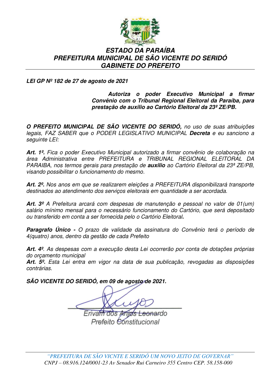 LEI 182/2021 - AUTORIZA O PODER EXECUTIVO MUNICIPAL A FIRMAR CONVÊNIO COM O TRIBUNAL REGIONAL ELEITORAL DA PARAÍBA PARA PRESTAÇÃO DE AUXILIO AO CARTÓRIO ELEITORAL DA 23ª ZE/P