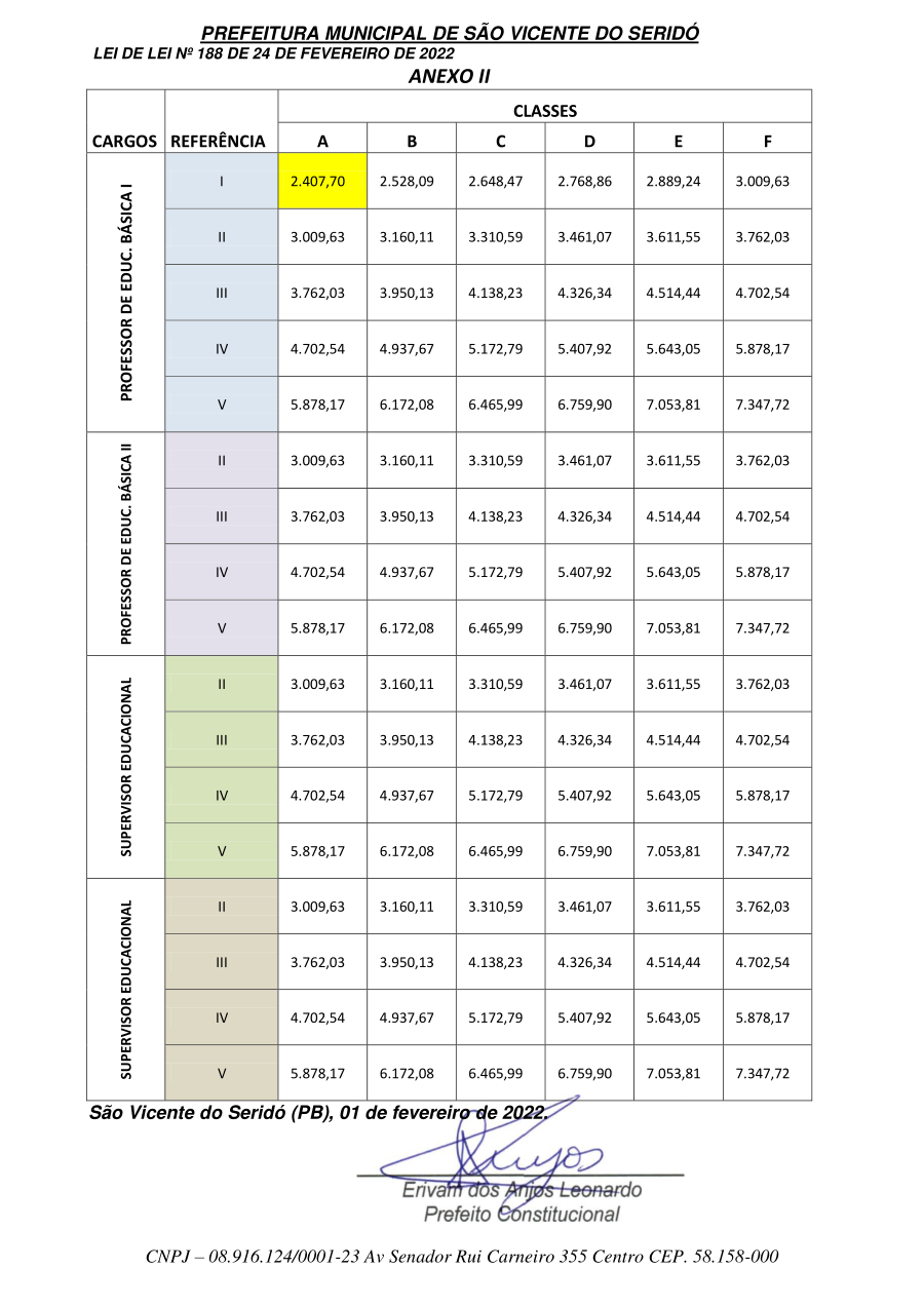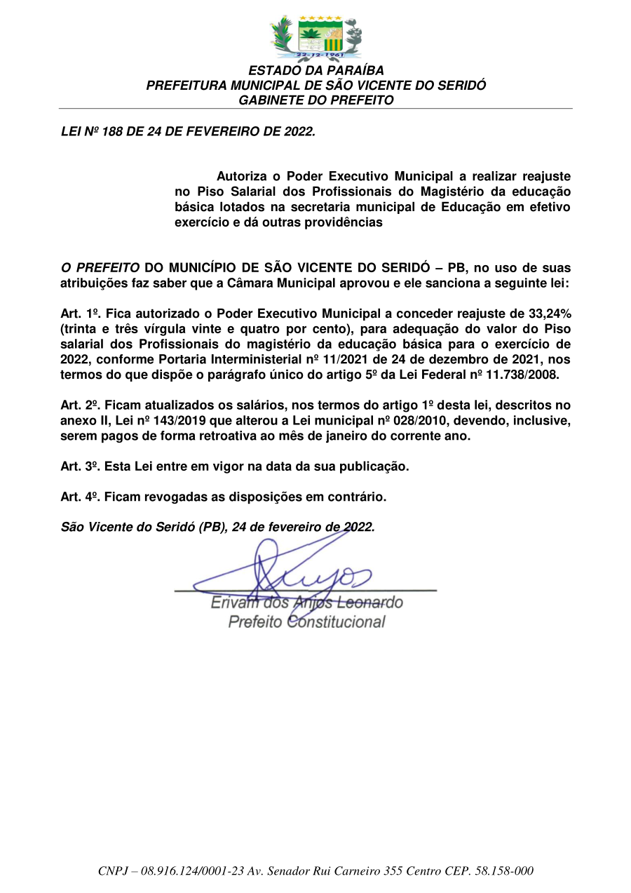 LEI 188 /2022 - AUTORIZA O PODER EXECUTIVO MUNICIPAL A REALIZAR REAJUSTE NO PISO SALARIAL DOS PROFISSIONAIS DO MAGISTÉRIO DA EDUCAÇÃO BÁSICA LOTADOS NA SECRETARIA MUNICIPAL DE EDUCAÇÃO EM EFETIVO EXERCÍCIO