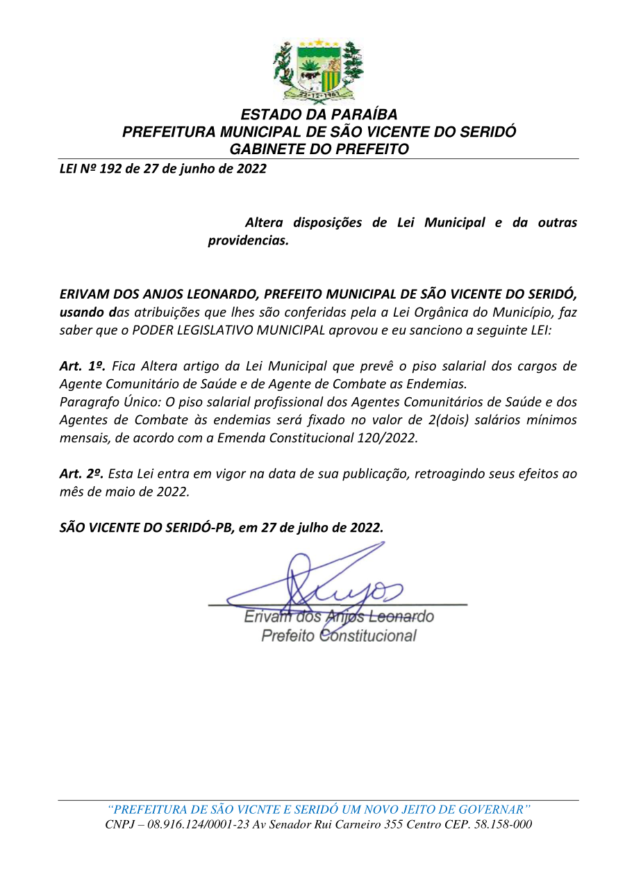 LEI 192/2022 - ALTERA DISPOSIÇÕES DE LEI MUNICIPAL E Dá OUTRAS PROVIDÊNCIA