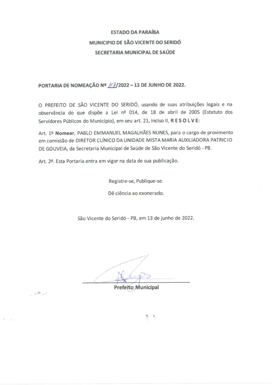 PORTARIA N° 0117/2022 - NOMEAÇÃO DE PABLO EMMANUEL MAGALHÃES NUNEs