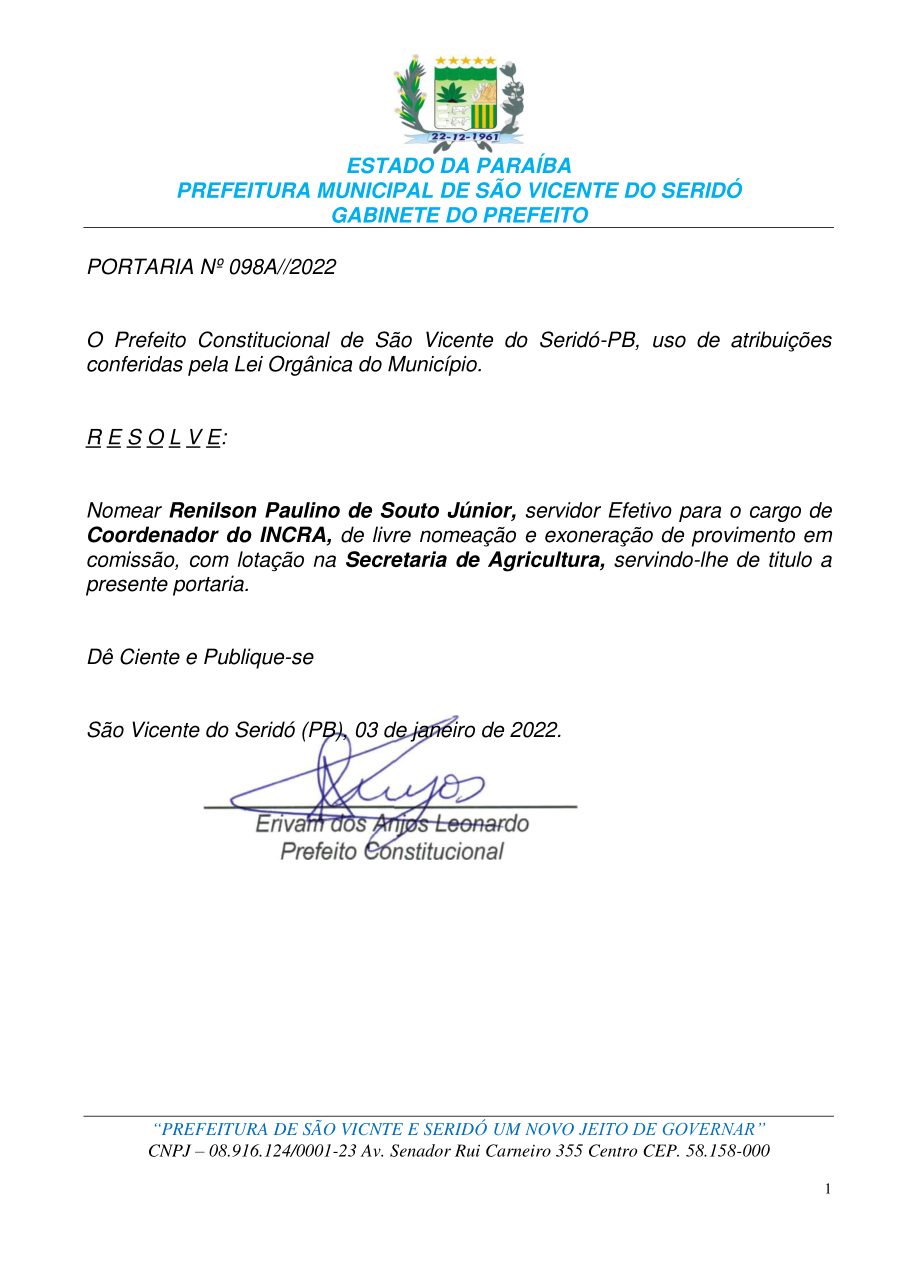 PORTARIA N° 0098A/2022 - NOMEAÇÃO DE Renilson Paulino de Souto Júnior