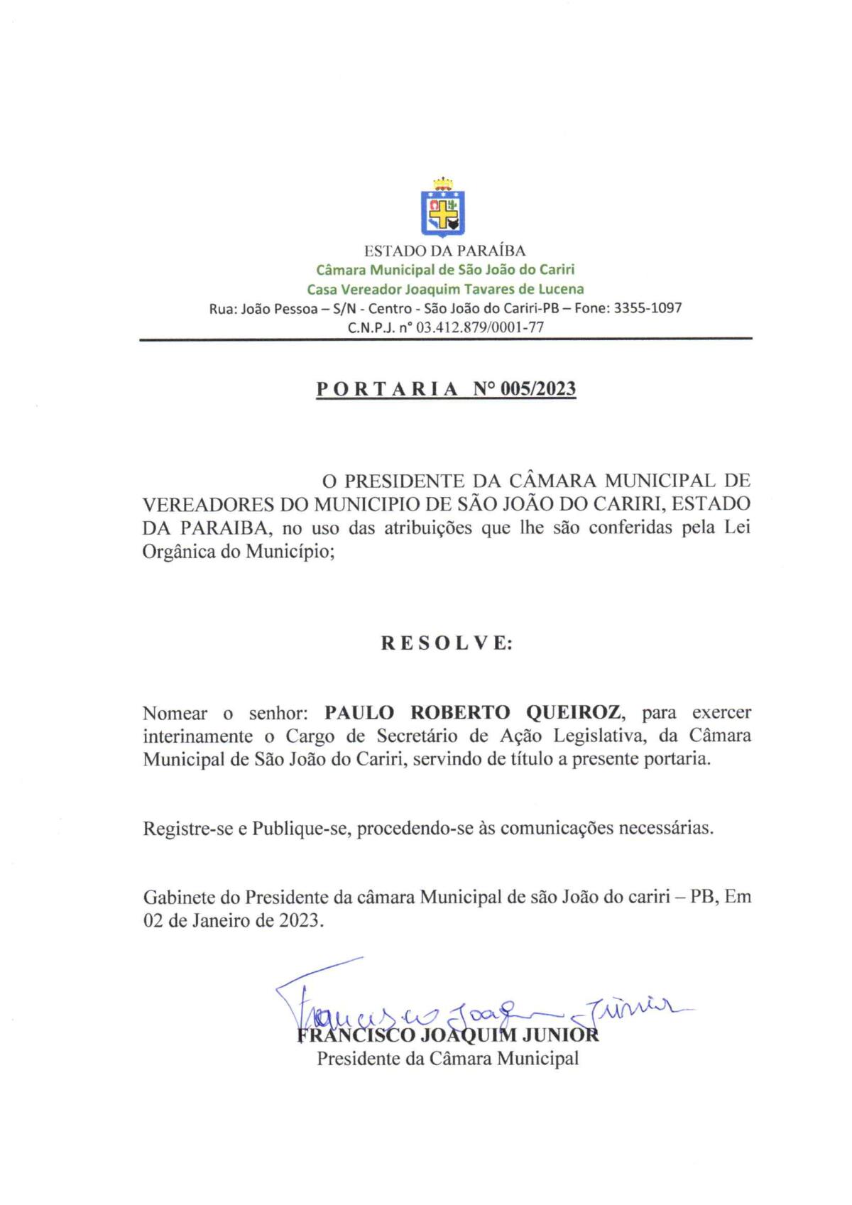 PORTARIA N° 0005/2023 - NOMEAÇÃO DE PAULO ROBERTO QUEIROZ