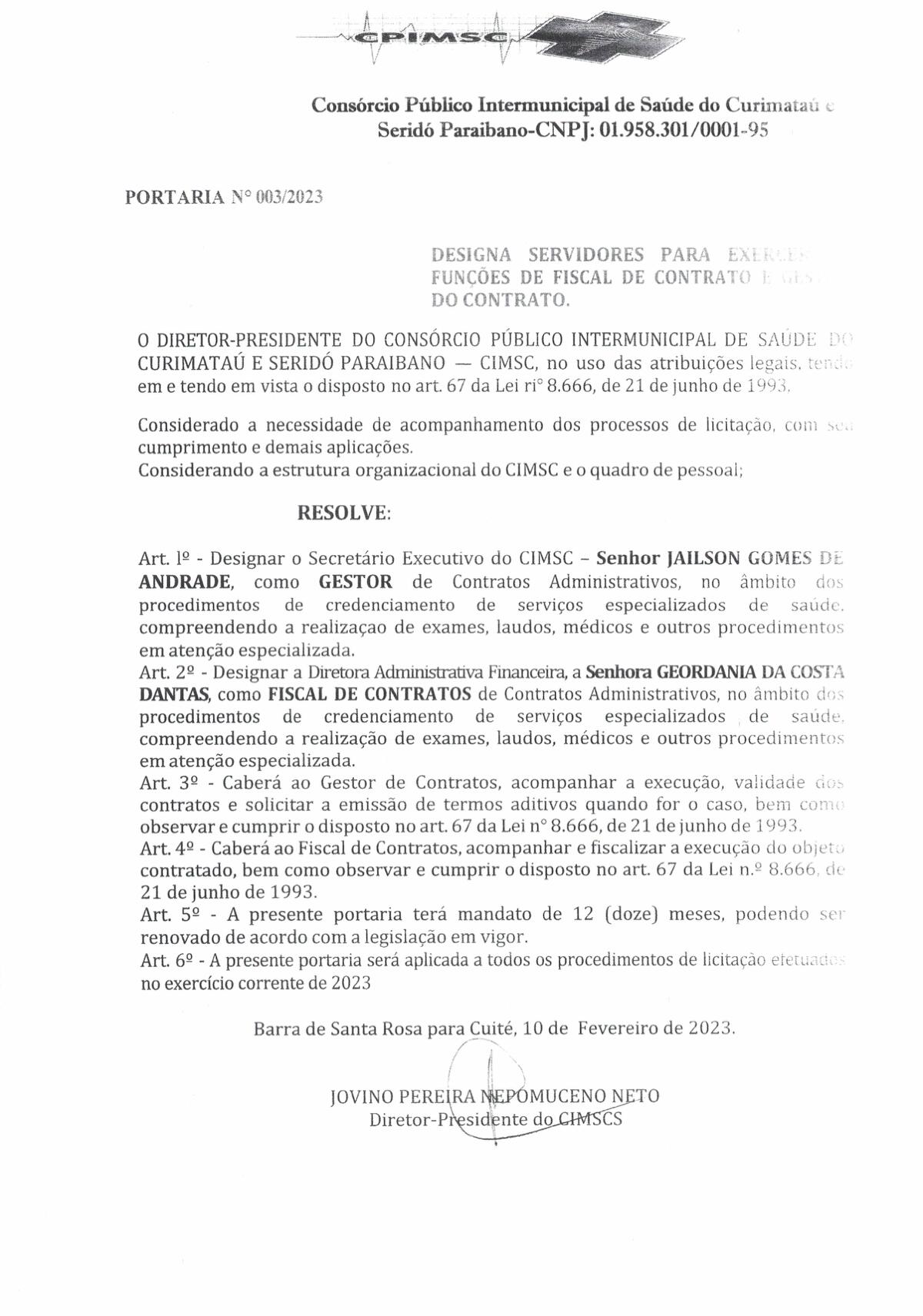 PORTARIA N° 0003/2023 - DESIGNA SERVIDORES PARA EXERCER FUNÇÕES DE FISCAL DE CONTRATO