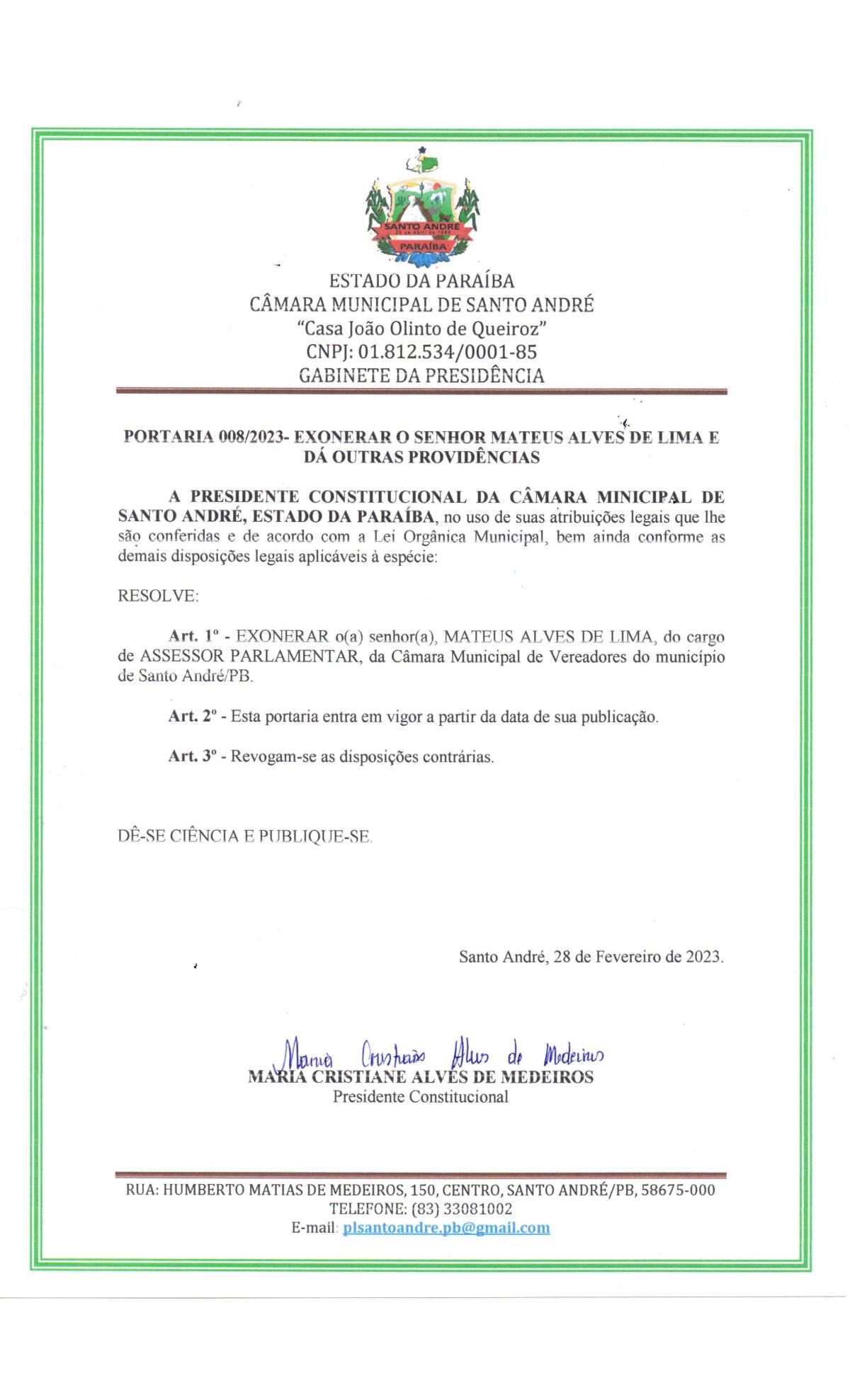 PORTARIA N° 0008/2023 - EXONERAÇÃO DE MATEUS ALVES DE LIMA