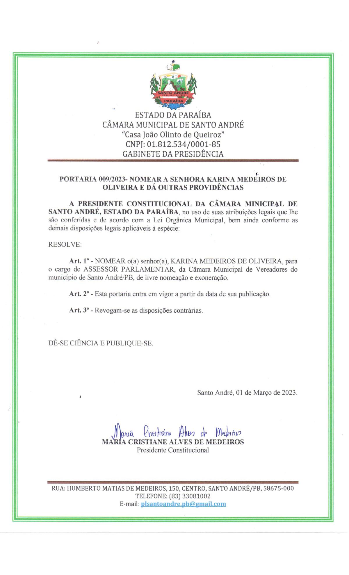 PORTARIA N° 0009/2023 - NOMEAÇÃO DE KARINA MEDEIROS DE OLIVEIRA