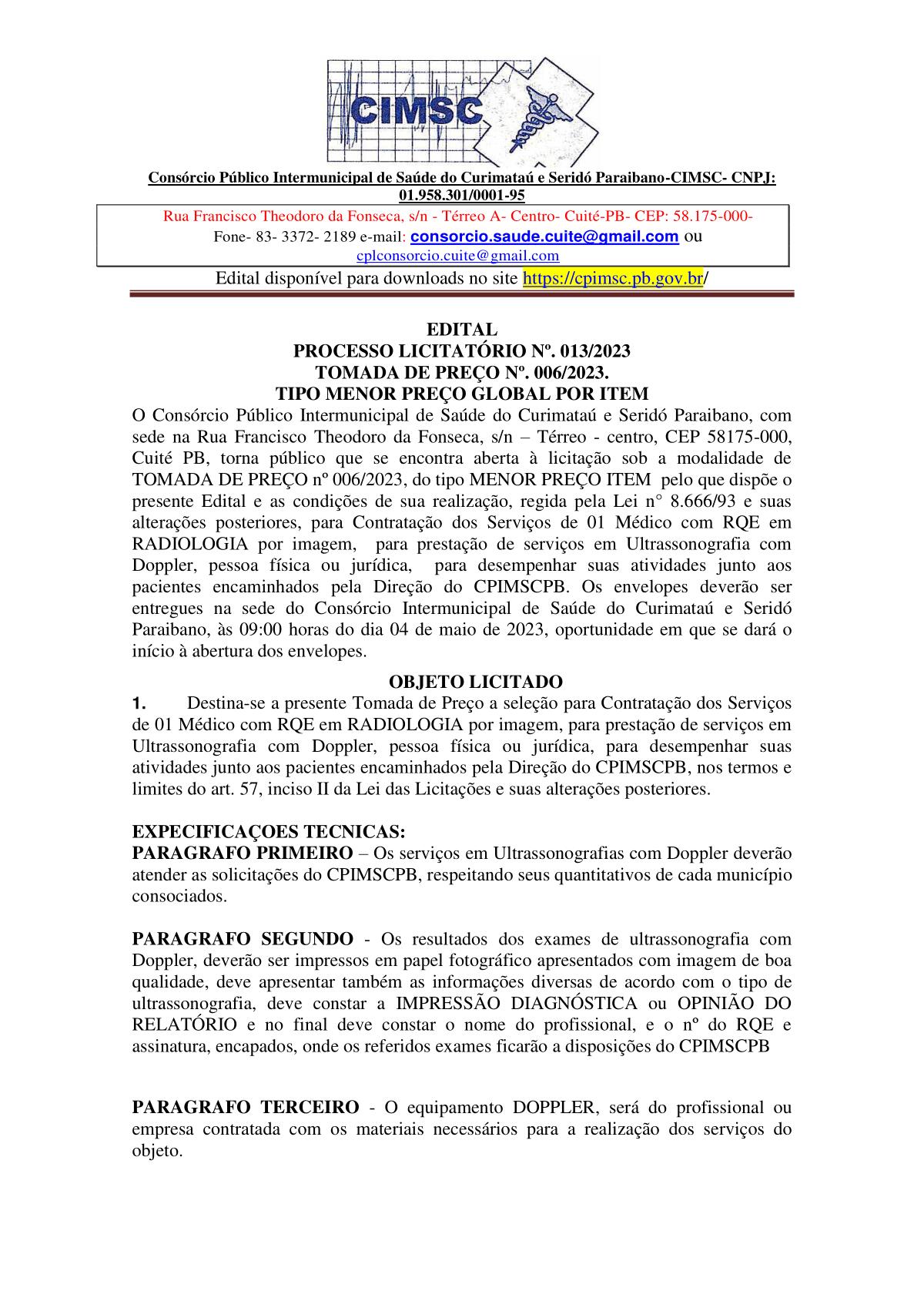EDITAL - PROCESSO LICITATÓRIO Nº 0013/2023 - TOMADA DE PREÇO Nº 0006/2023.