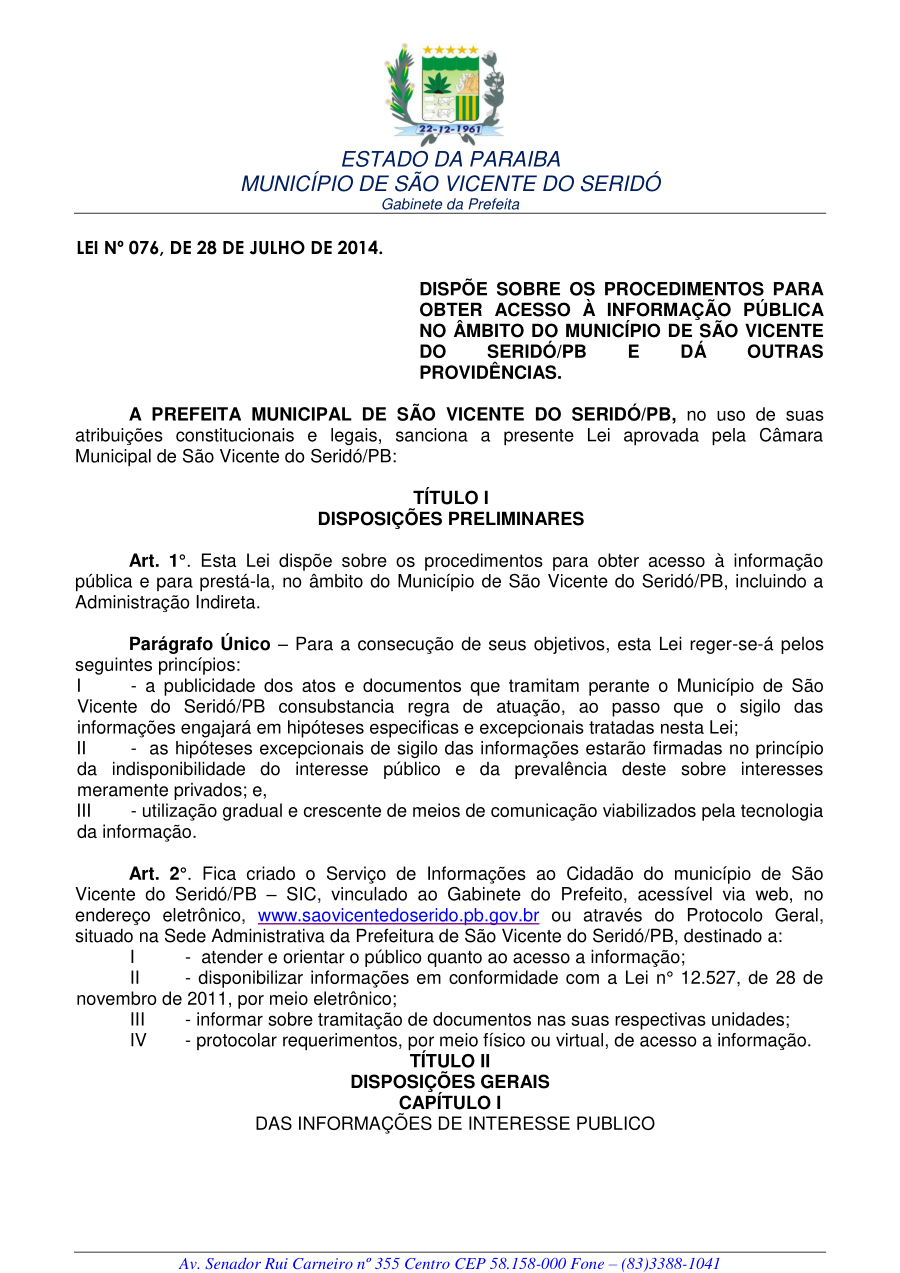 LEI Nº 0076/2014 - DISPÕE SOBRE OS PROCEDIMENTOS PARA OBTER ACESSO À INFORMAÇÃO PÚBLICA NO ÂMBITO DO MUNICÍPI