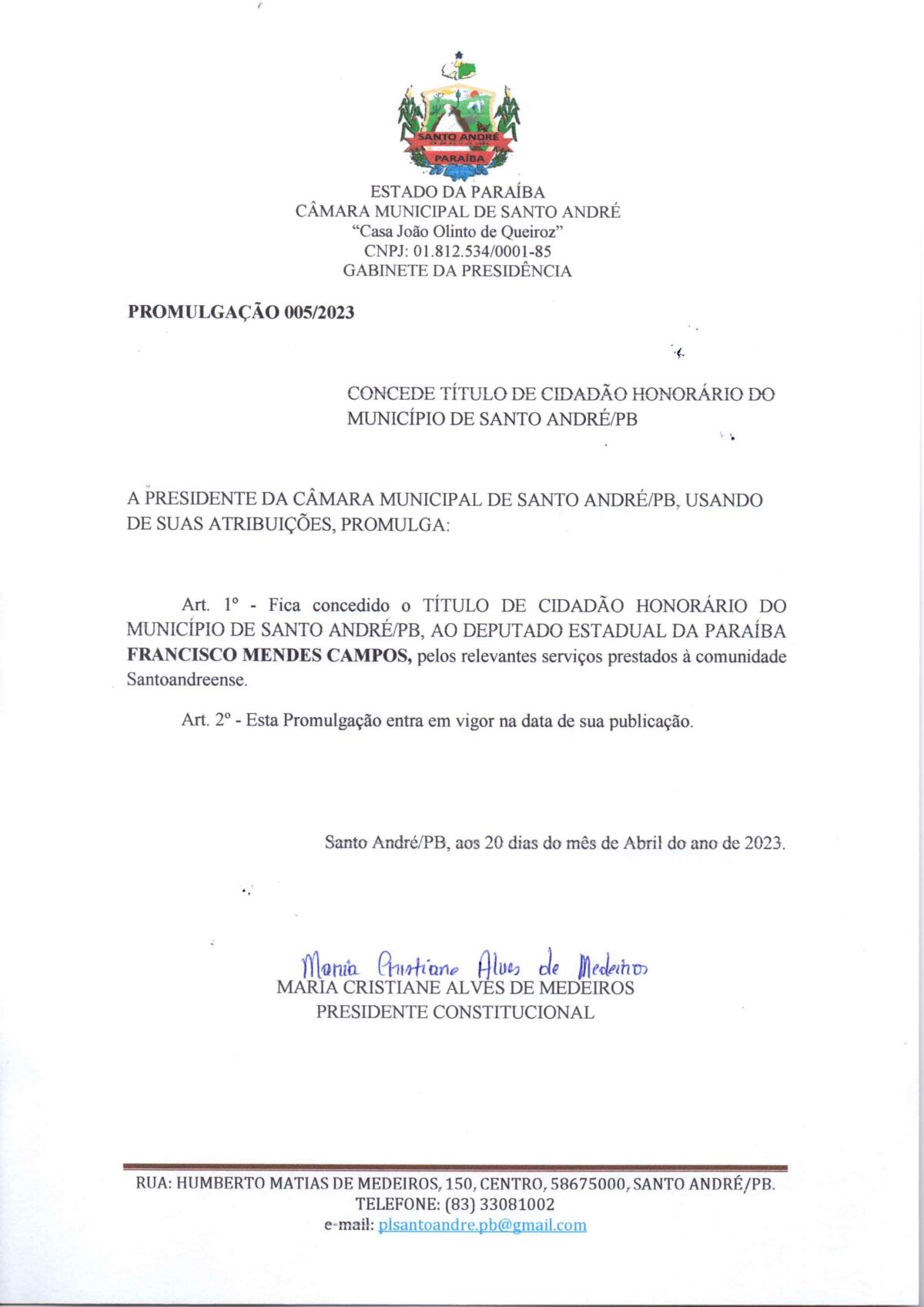 PROMULGAÇÃO N° 0005/2023 - CONCEDE TÍTULO DE CIDADÃO HONORÁRIO DO MUNICÍPIO DE SANTO ANDRÉ/PB