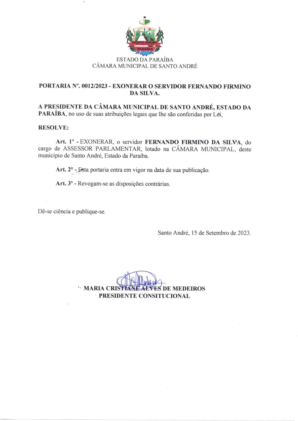 PORTARIA N° 0012/2023 - EXONERAR O SERVIDOR FERNANDO FIRMINO DA SILVA