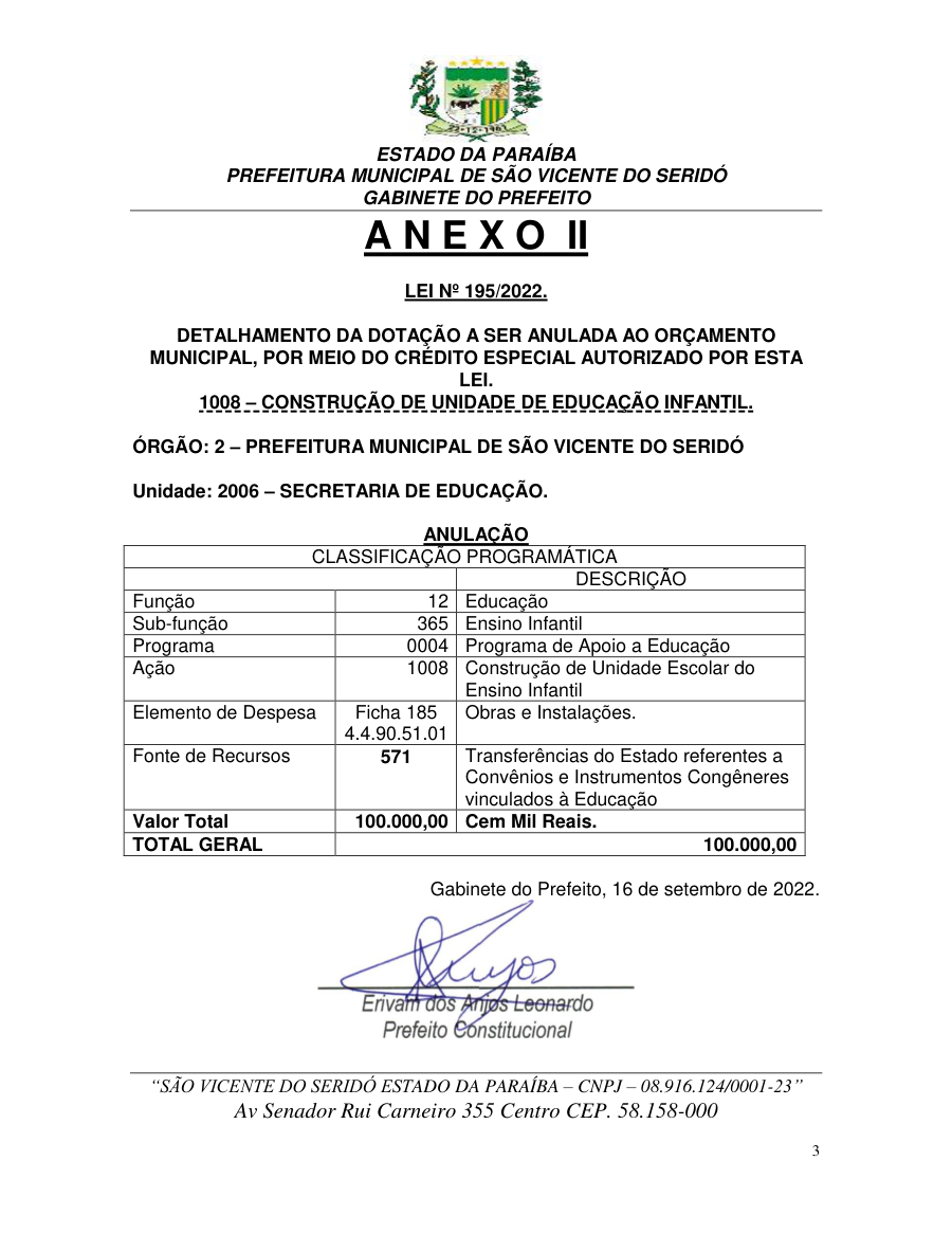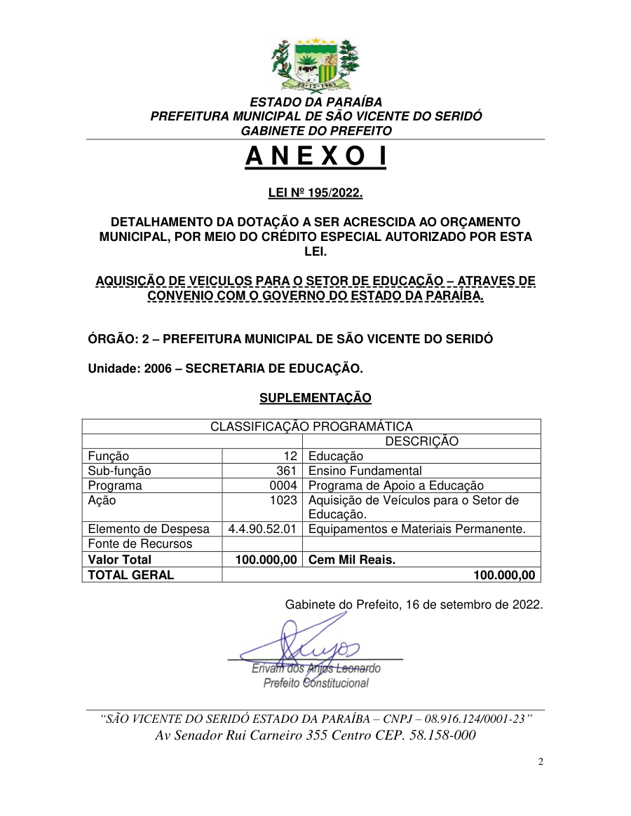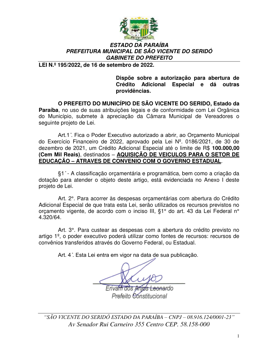 LEI N.º 195/2022 - DISPÕE SOBRE A AUTORIZAÇÃO PARA ABERTURA DE CRÉDITO ADICIONAL ESPECIAL E DÁ OUTRAS PROVIDÊNCIAS.