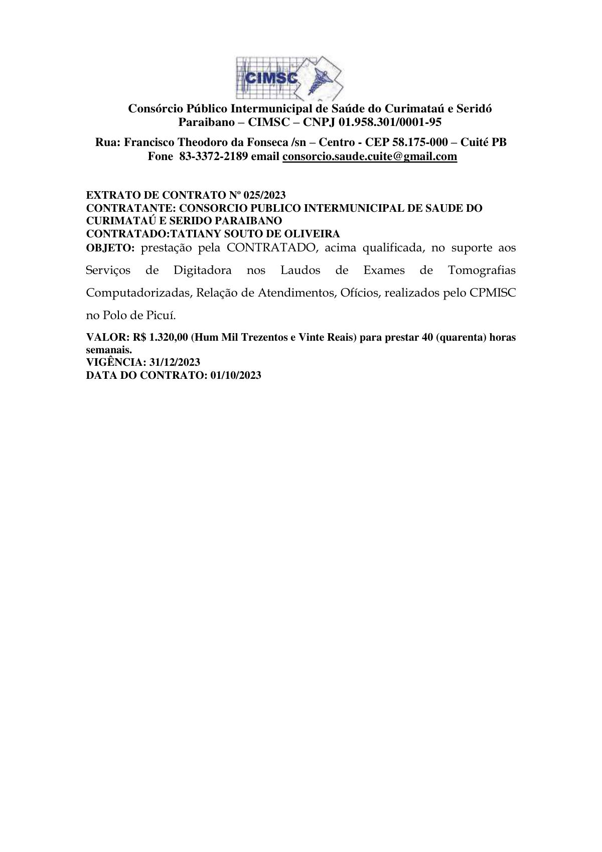 Conforme MP n° 2.200-2 de 24/08/2001, que institui a infraestrutura de chaves Públicas. Matéria Publicada no Diário Oficial do Consórcio Intermunicipal de Saúde do Curimataú e Seridó Paraibano/PB no dia - Edição 00848.