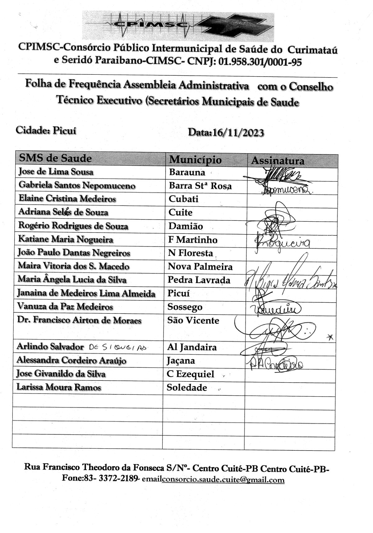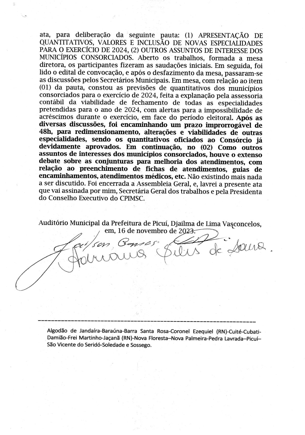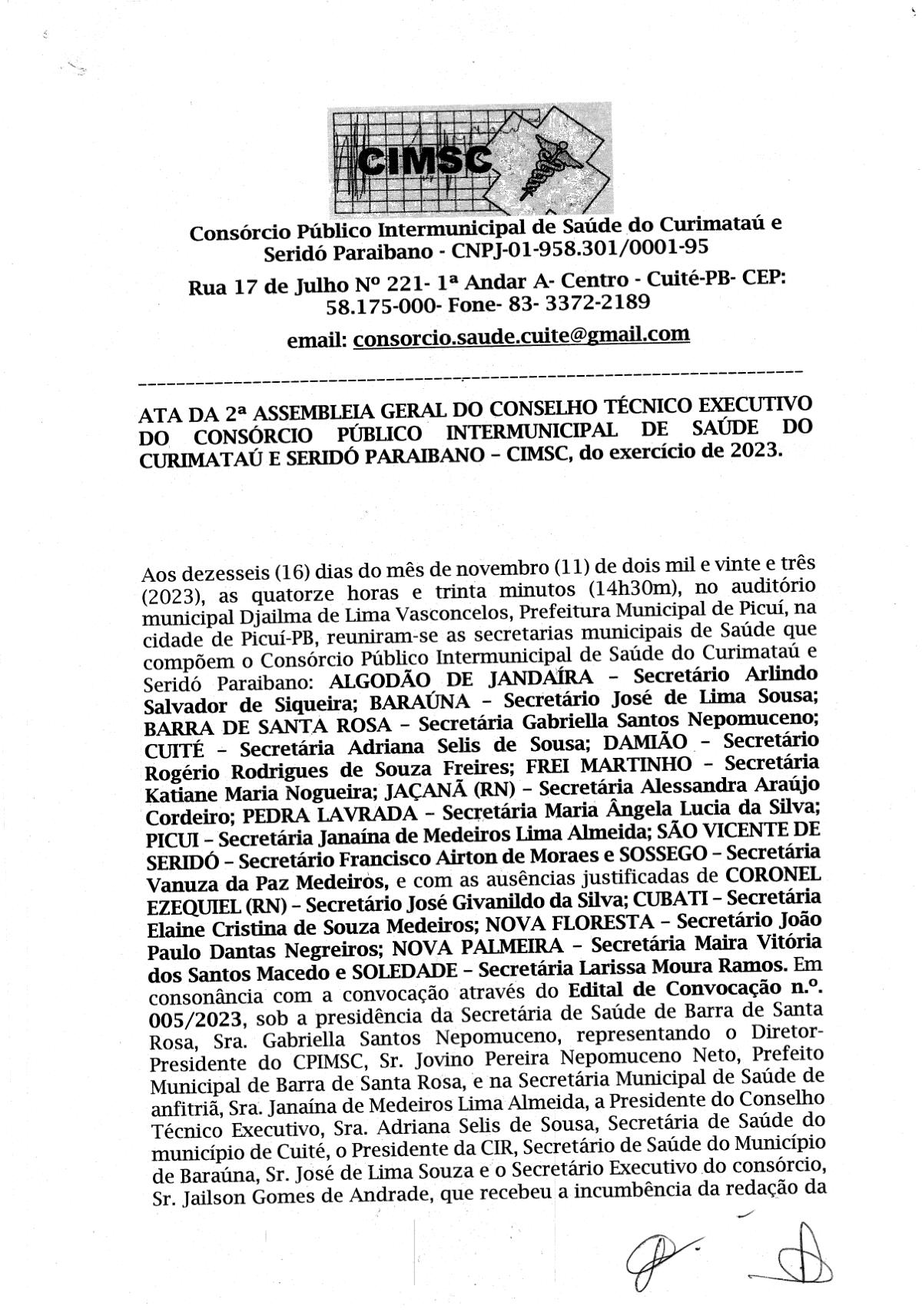 ATA DA SEGUNFA ASSEMBLEIA GERA DO CONSELHO TÉCNICO EXECUTIVO DO CONSÓRCIO PÚBLICO INTERMUNICIPAL DE SAÚDE DO CURIMATAÚ E SERIDÓ PARAIBANO