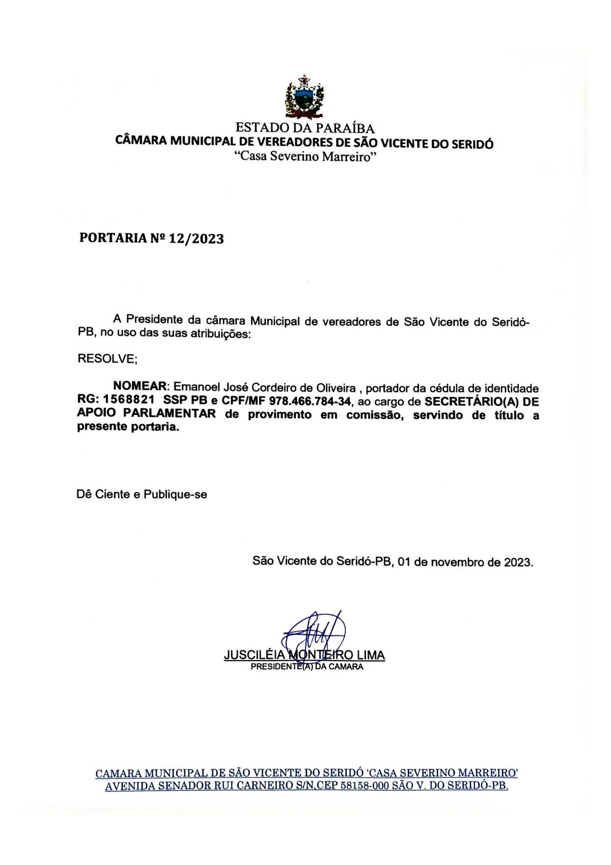 PORTARIA N° 0012/2023 - NOMEAÇÃO DE EMANOEL JOSÉ CORDEIRO DE OLIVEIRA