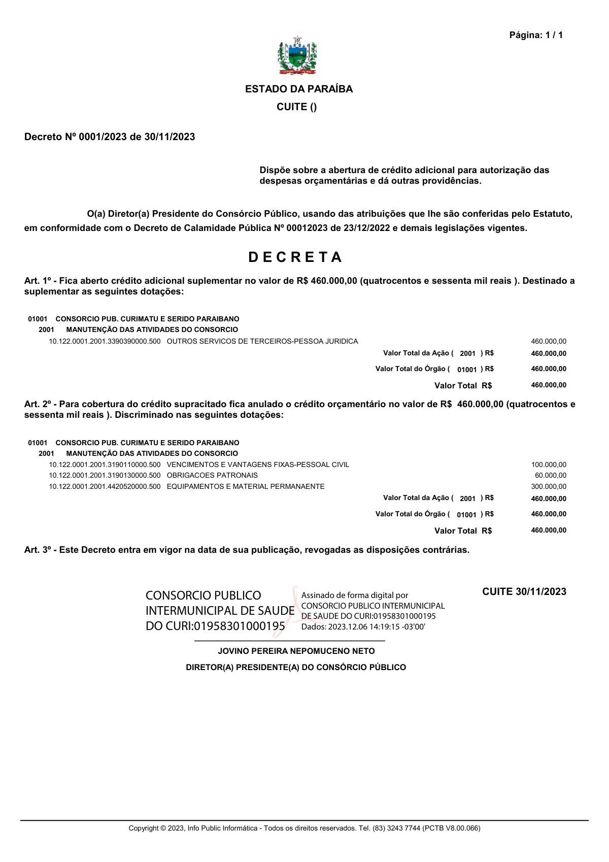 Conforme MP n° 2.200-2 de 24/08/2001, que institui a infraestrutura de chaves Públicas. Matéria Publicada no Diário Oficial do Consórcio Intermunicipal de Saúde do Curimataú e Seridó Paraibano/PB no dia - Edição 00873.