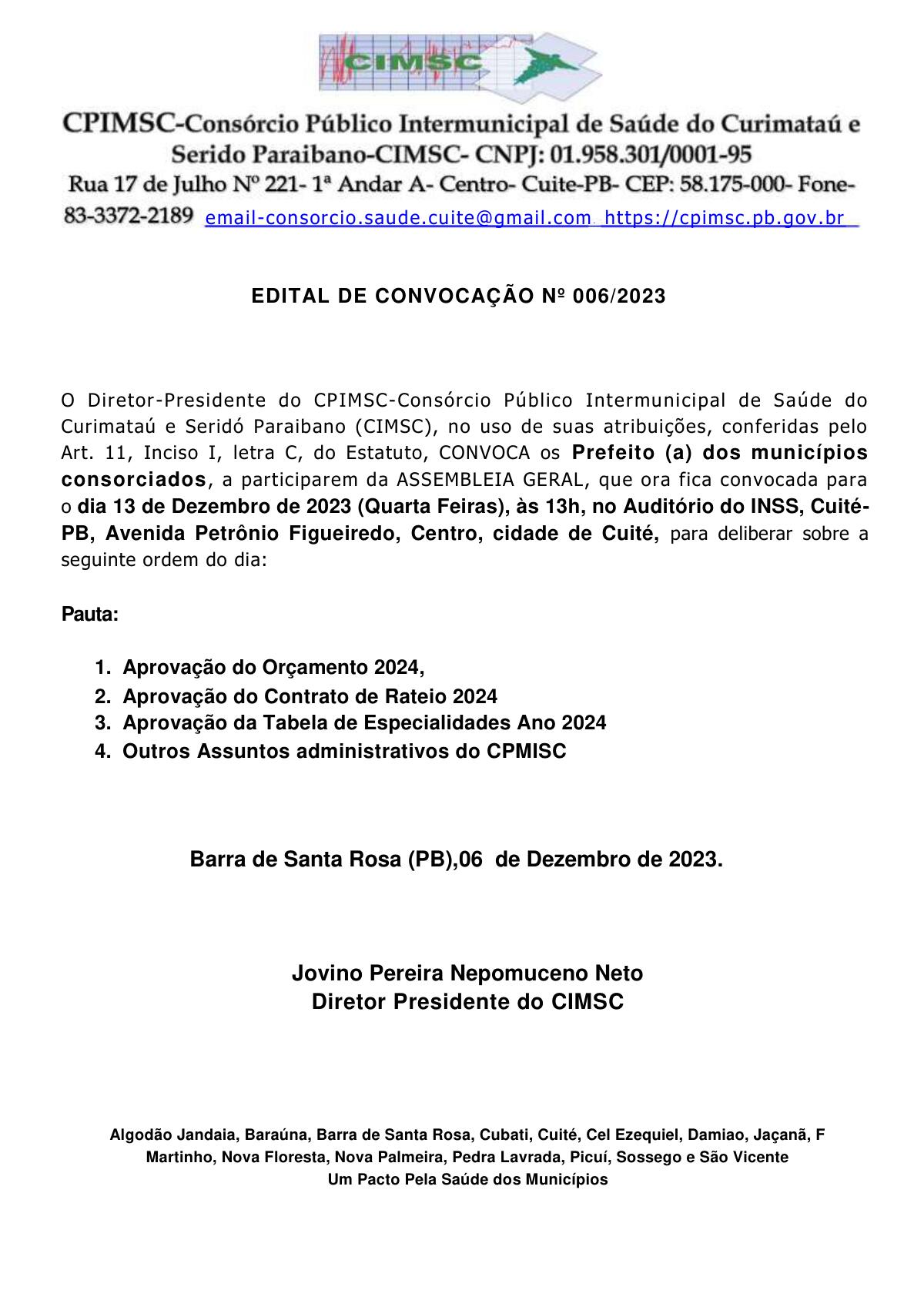 EDITAL DE CONVOCAÇÃO N° 0006/2023