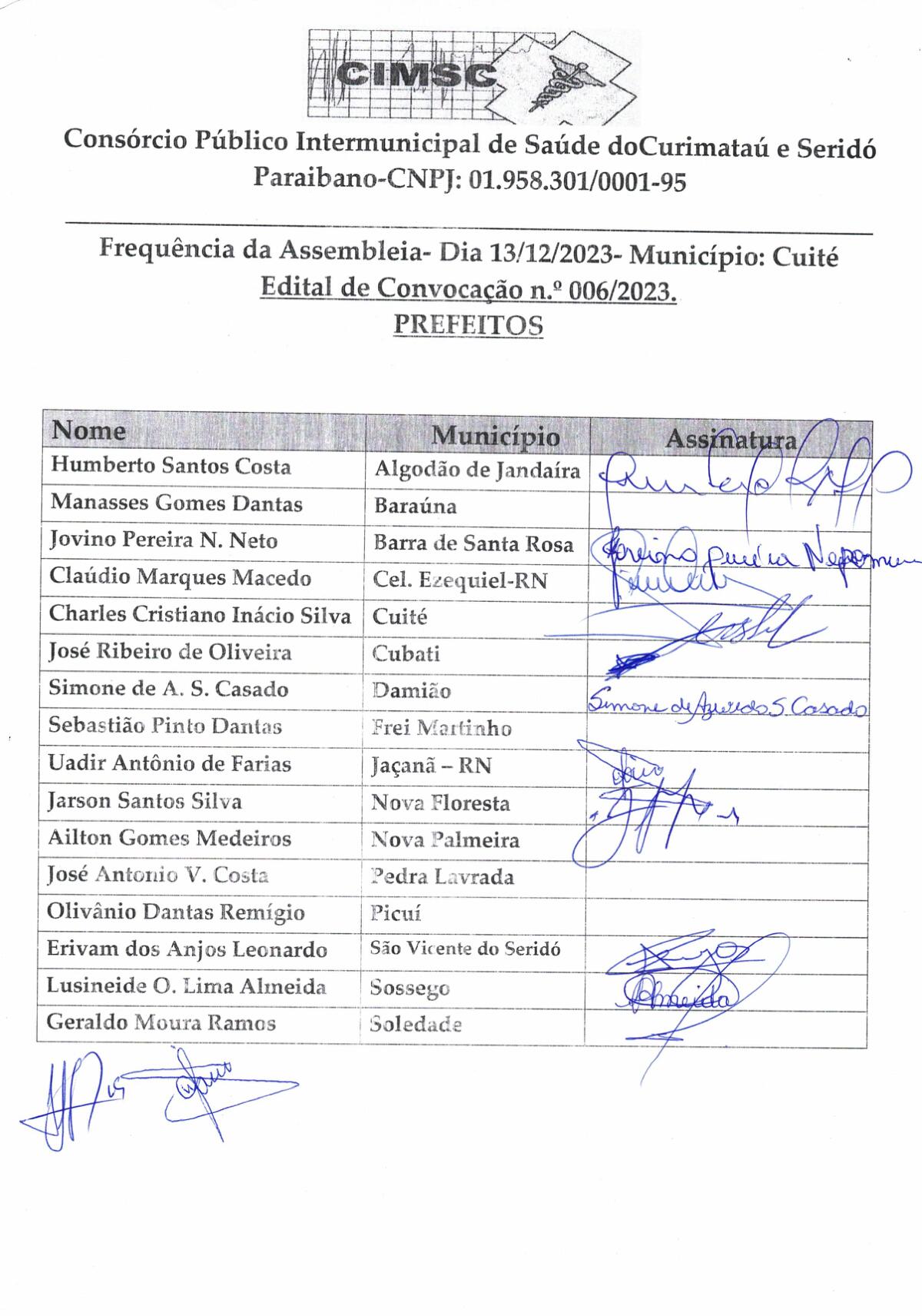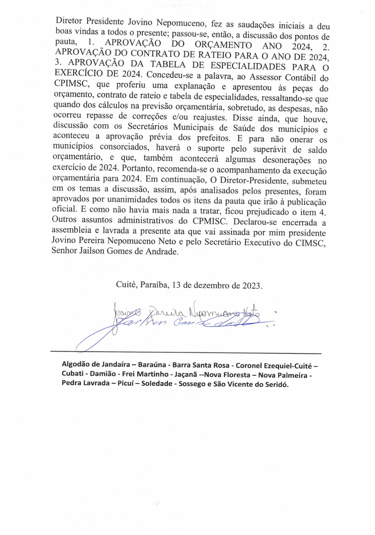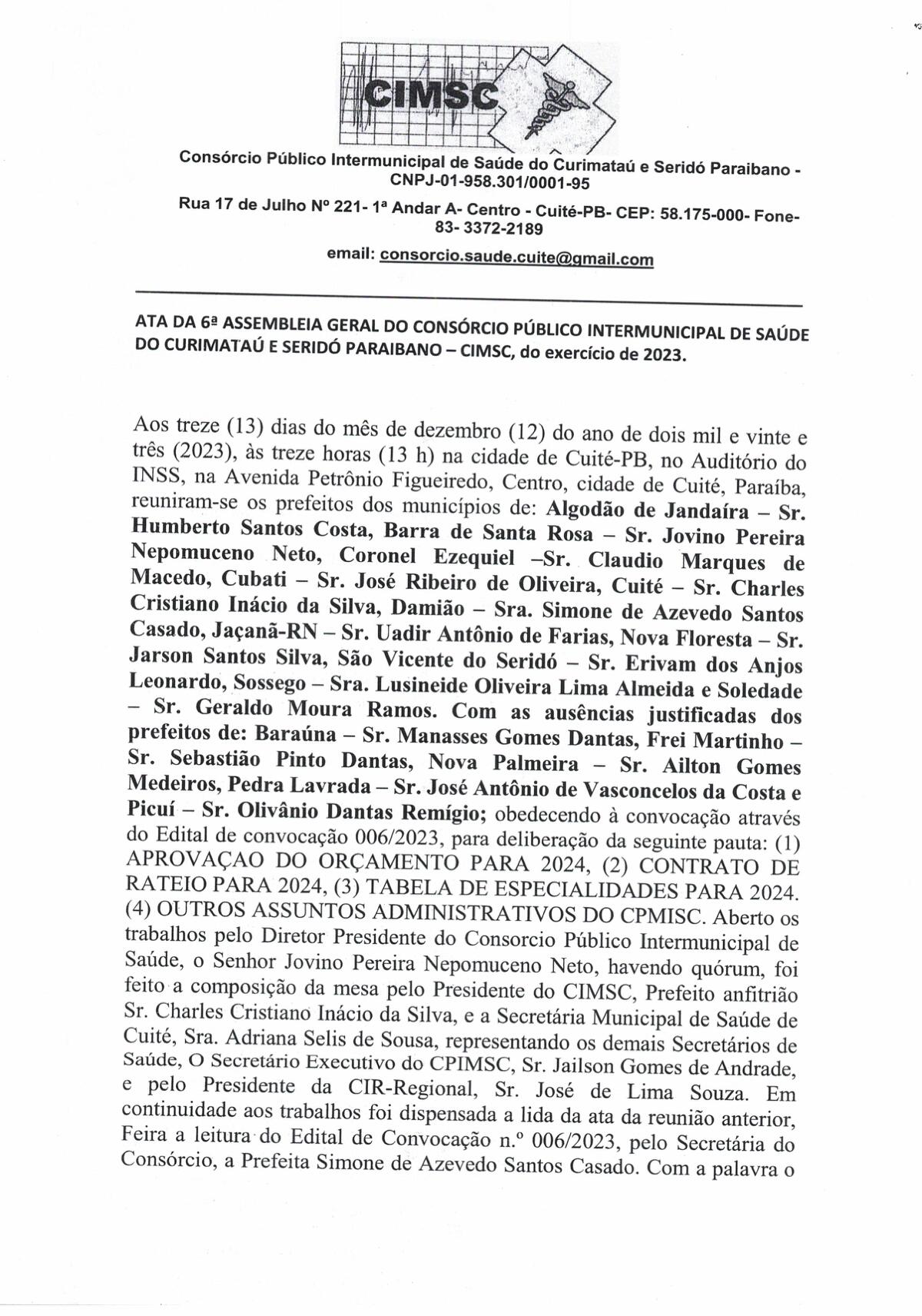 ATA DA 6ª ASSEMBLÉIA GERAL DO CONSÓRCIO PÚBLICO INTERMUNICIPAL DE SAÚDE DO CURIMATAÚ E SERIDÓ PARAIBANO - CIMSC, DO EXERCÍCIO DE 2023