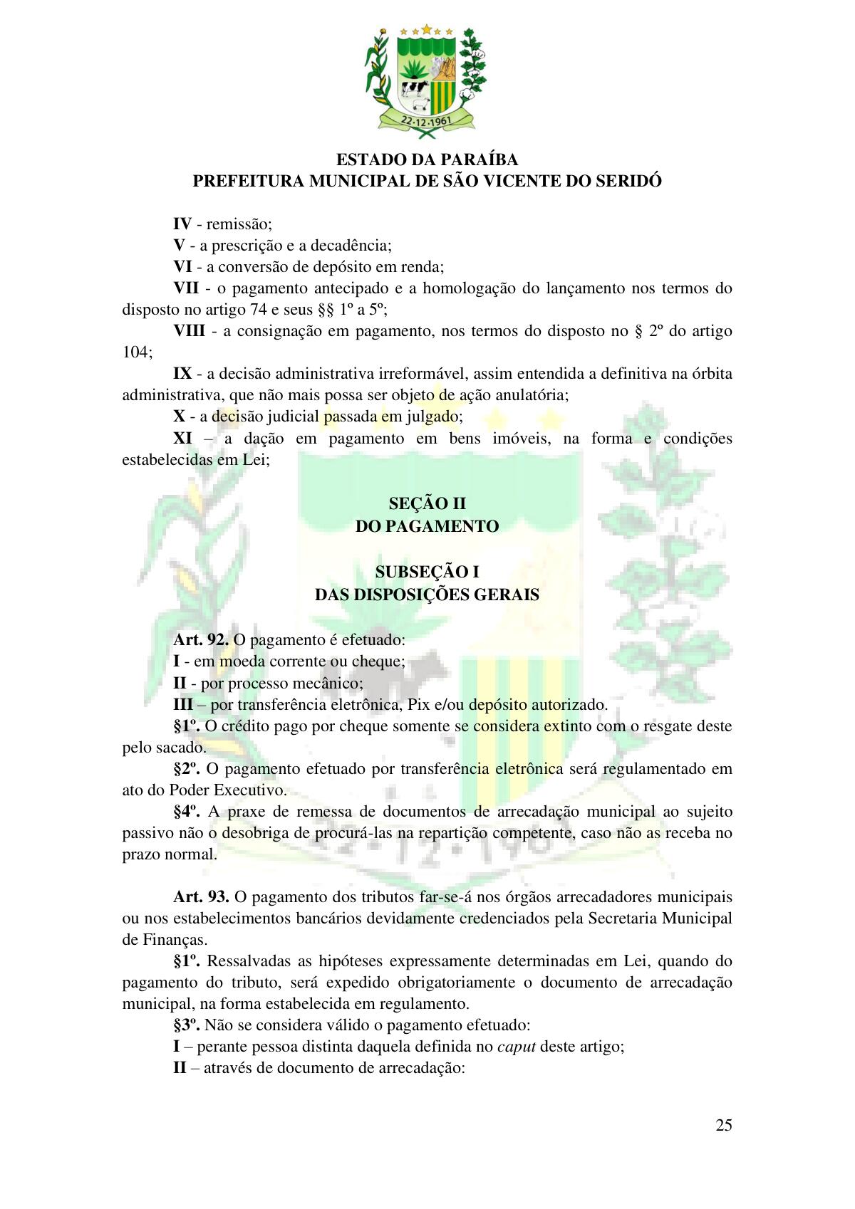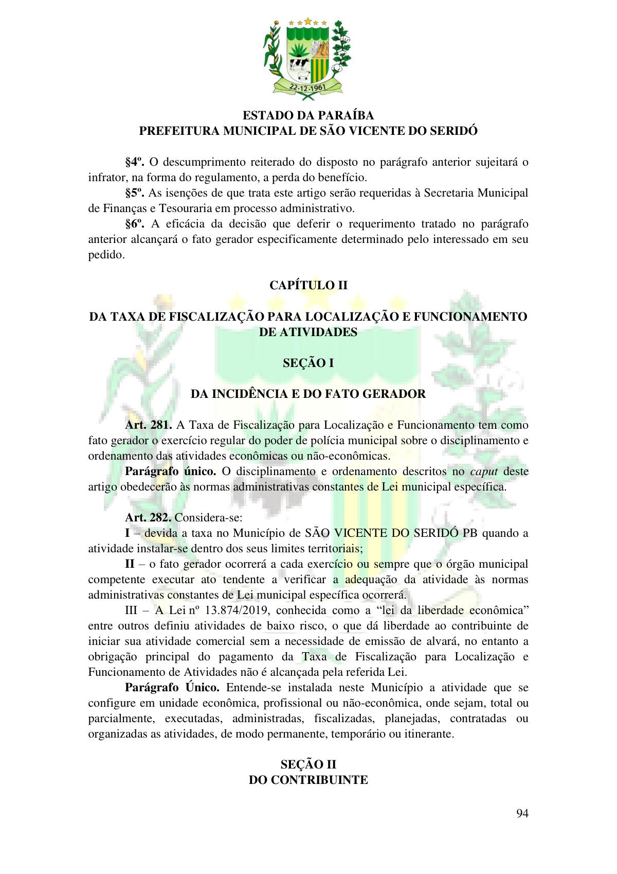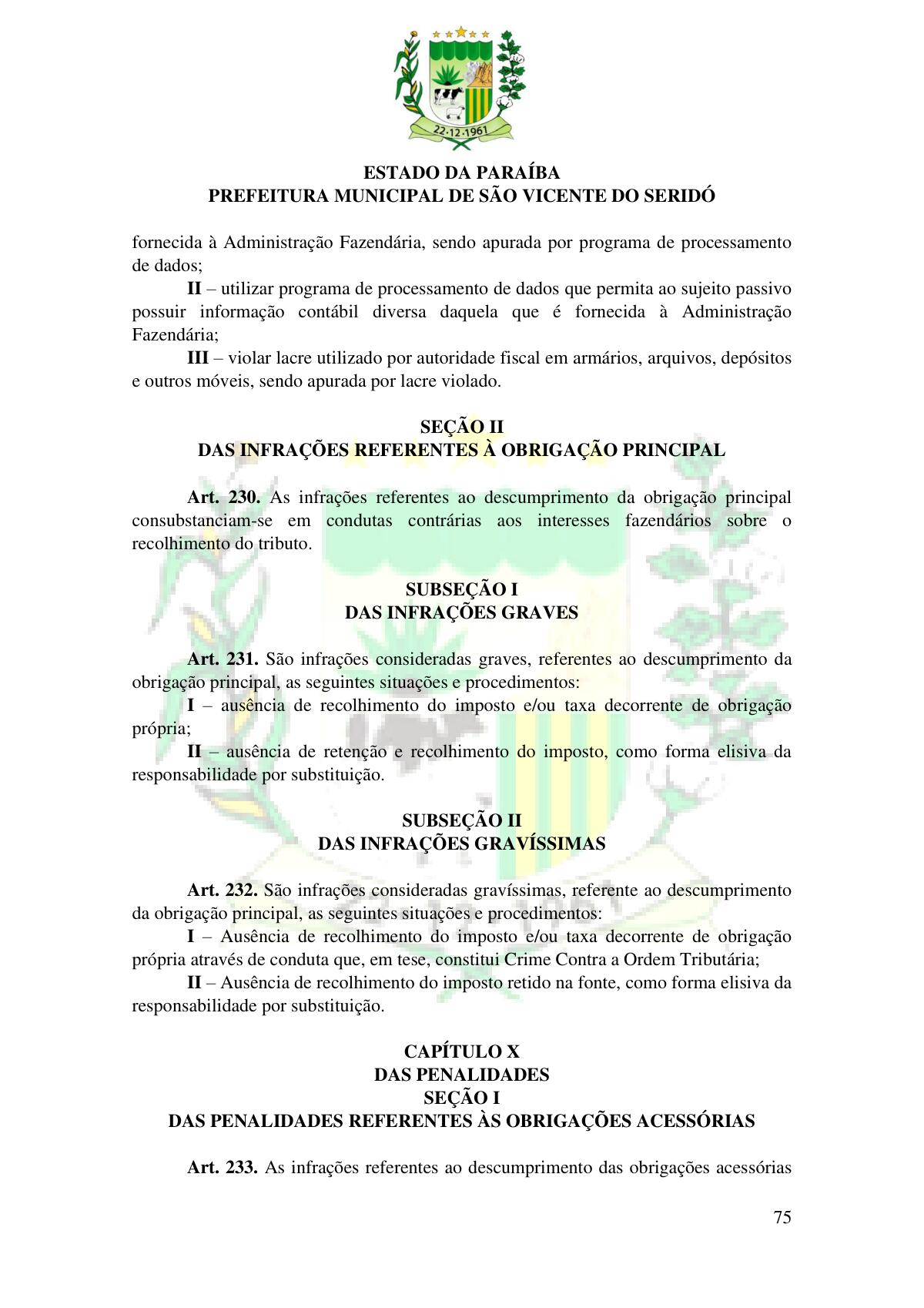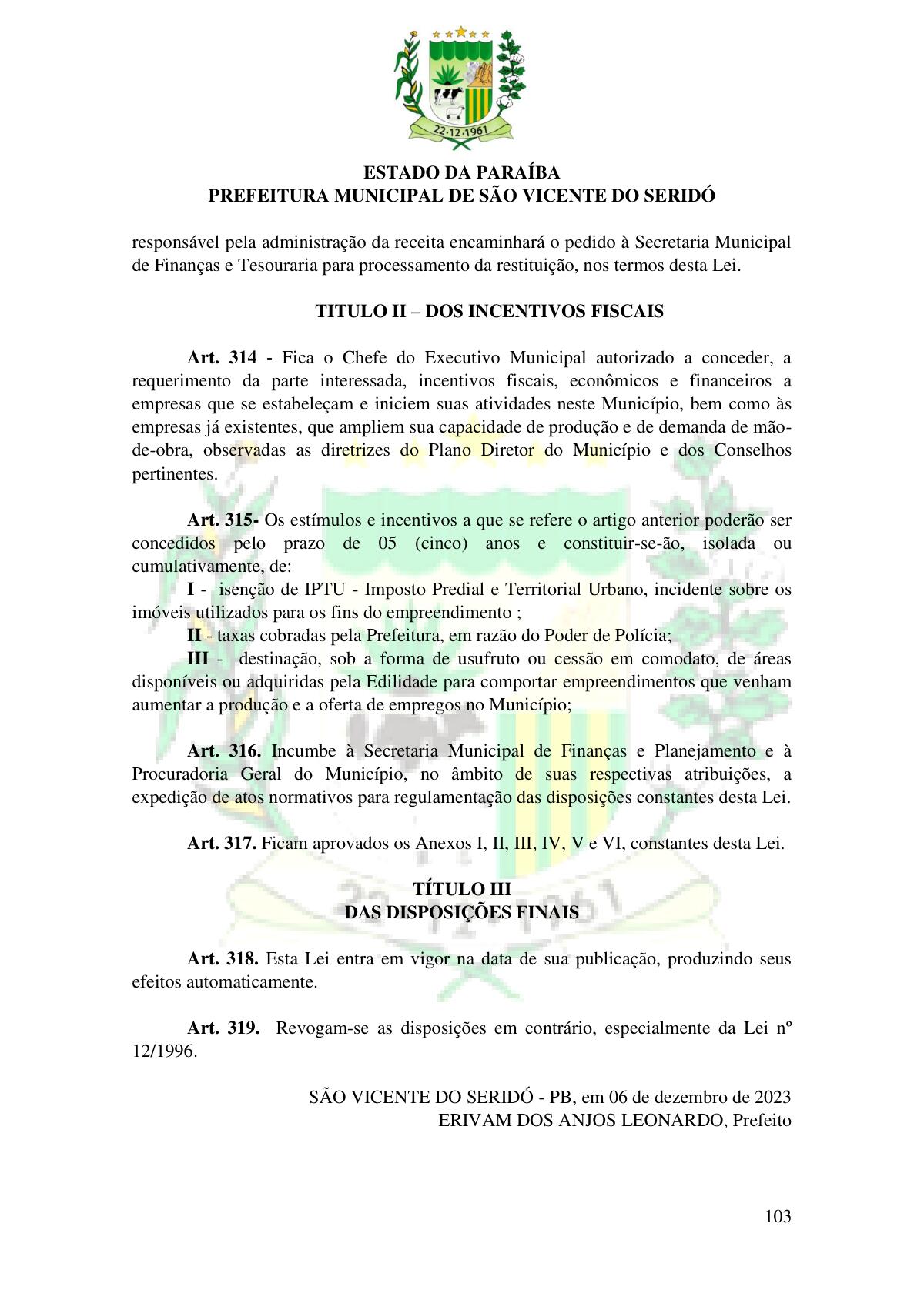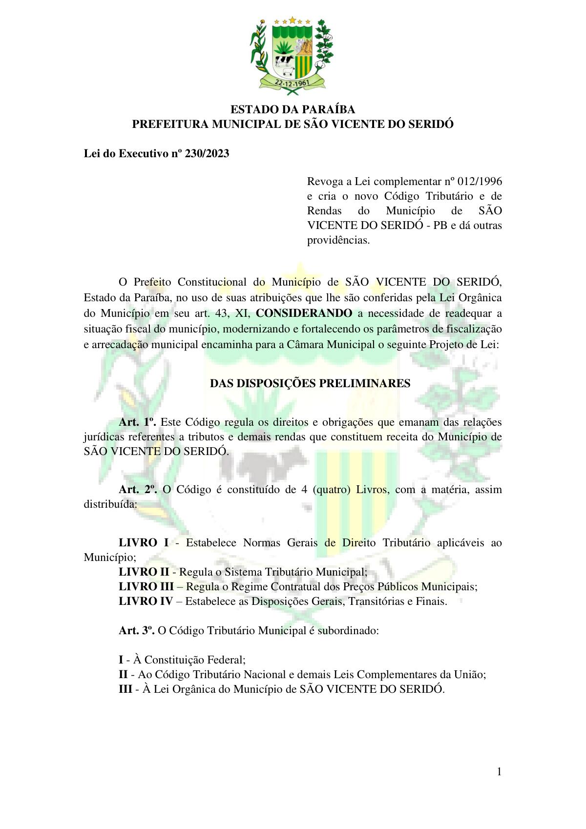 LEI Nº 230/2023 - REVOGA A LEI COMPLEMENTAR Nº 012/1996 E CRIA O NOVO CÓDIGO TRIBUTÁRIO E DE RENDAS DO MUNICÍPIO DE SÃO VICENTE DO SERIDÓ - PB E DÁ OUTRAS PROVIDÊNCIAS.