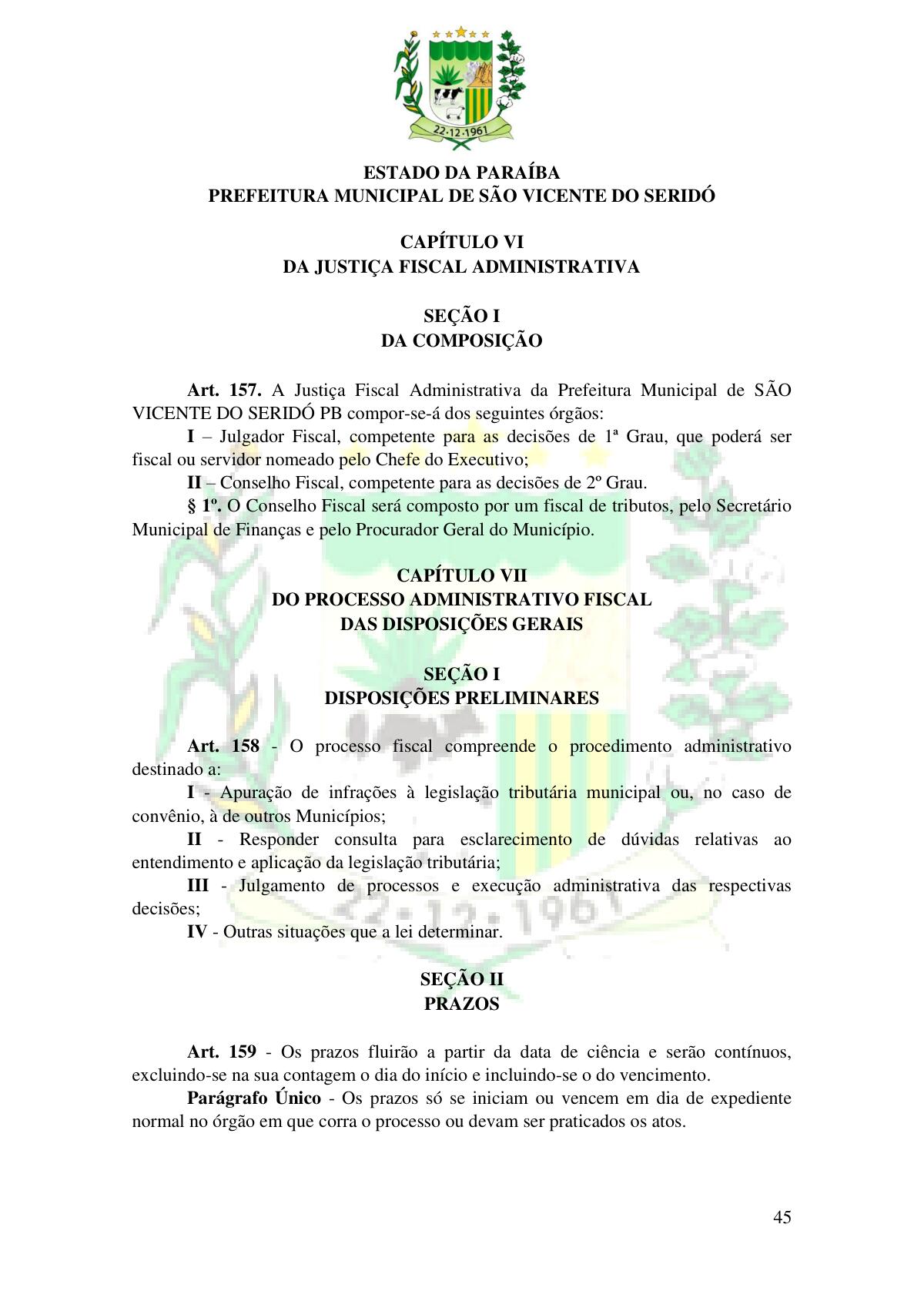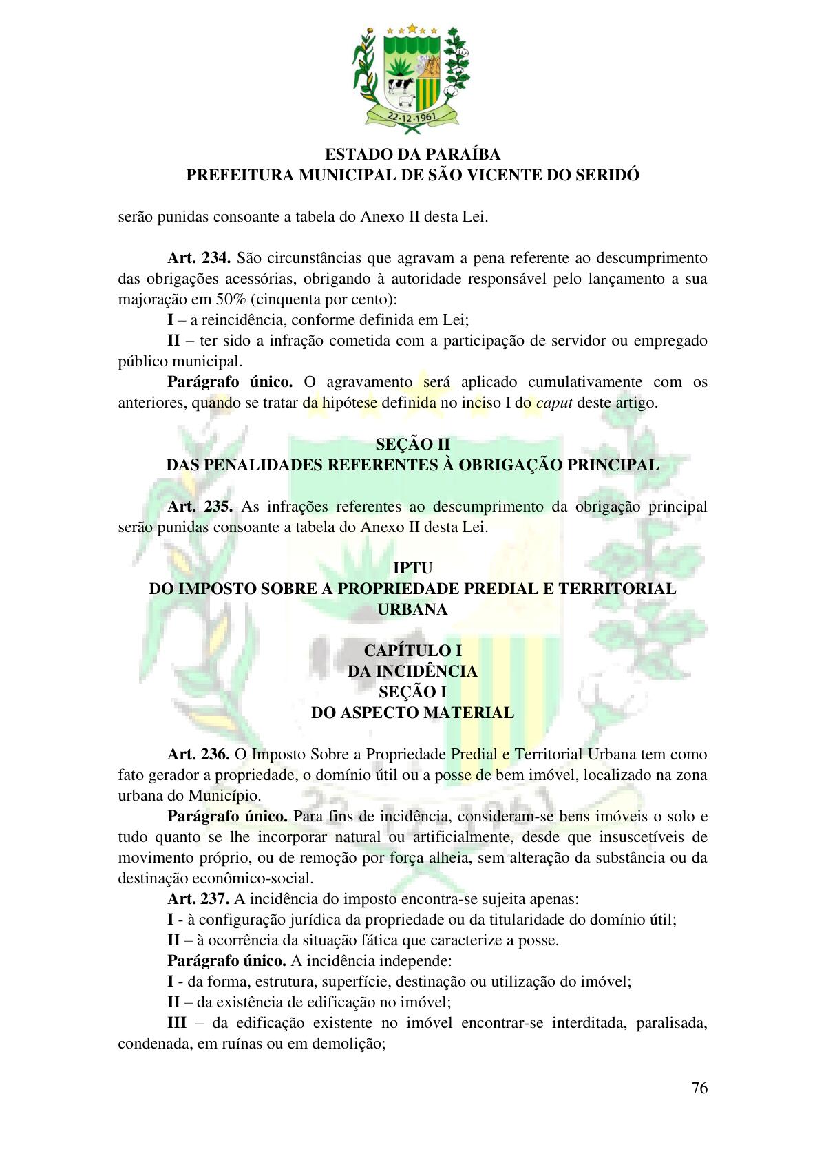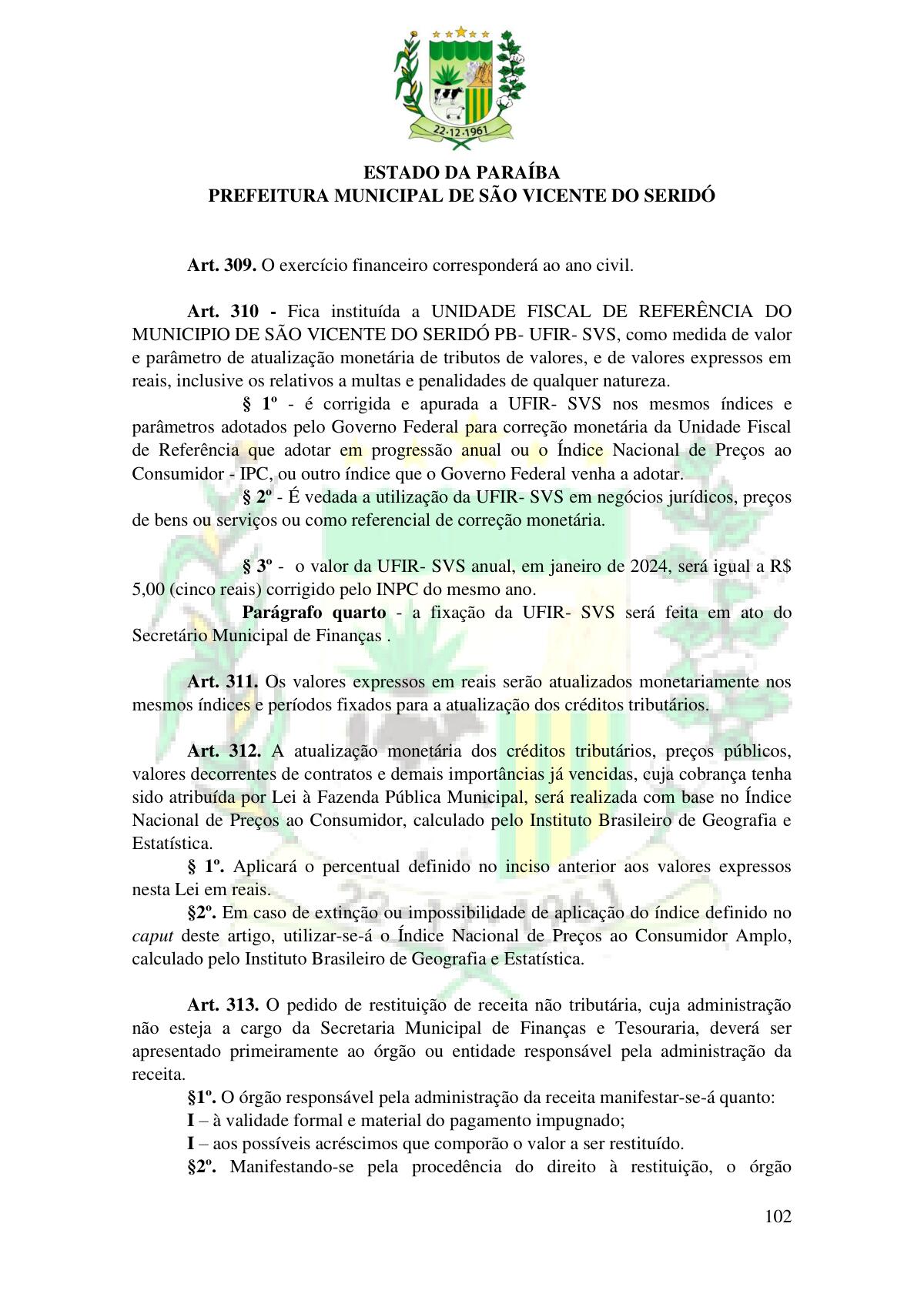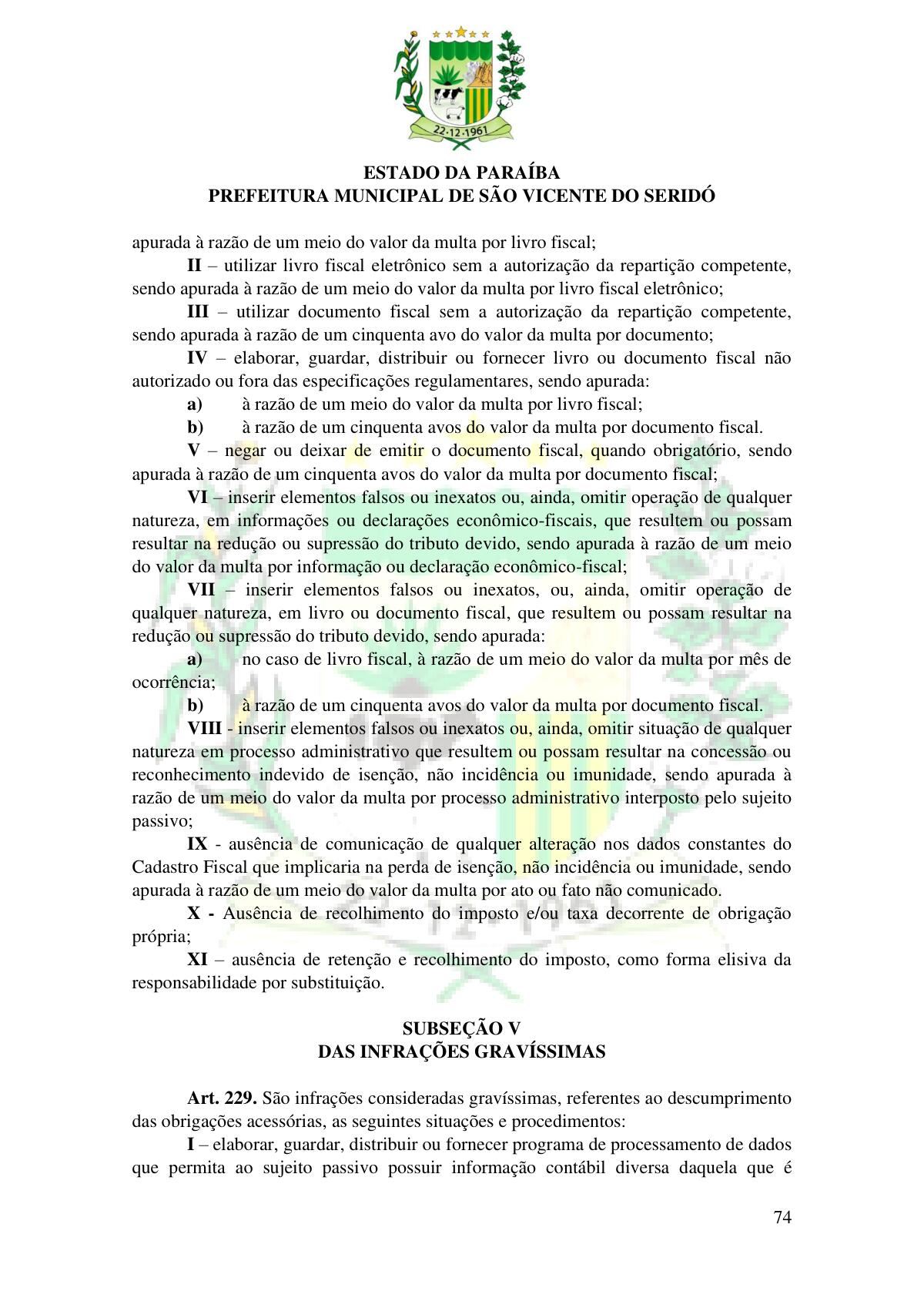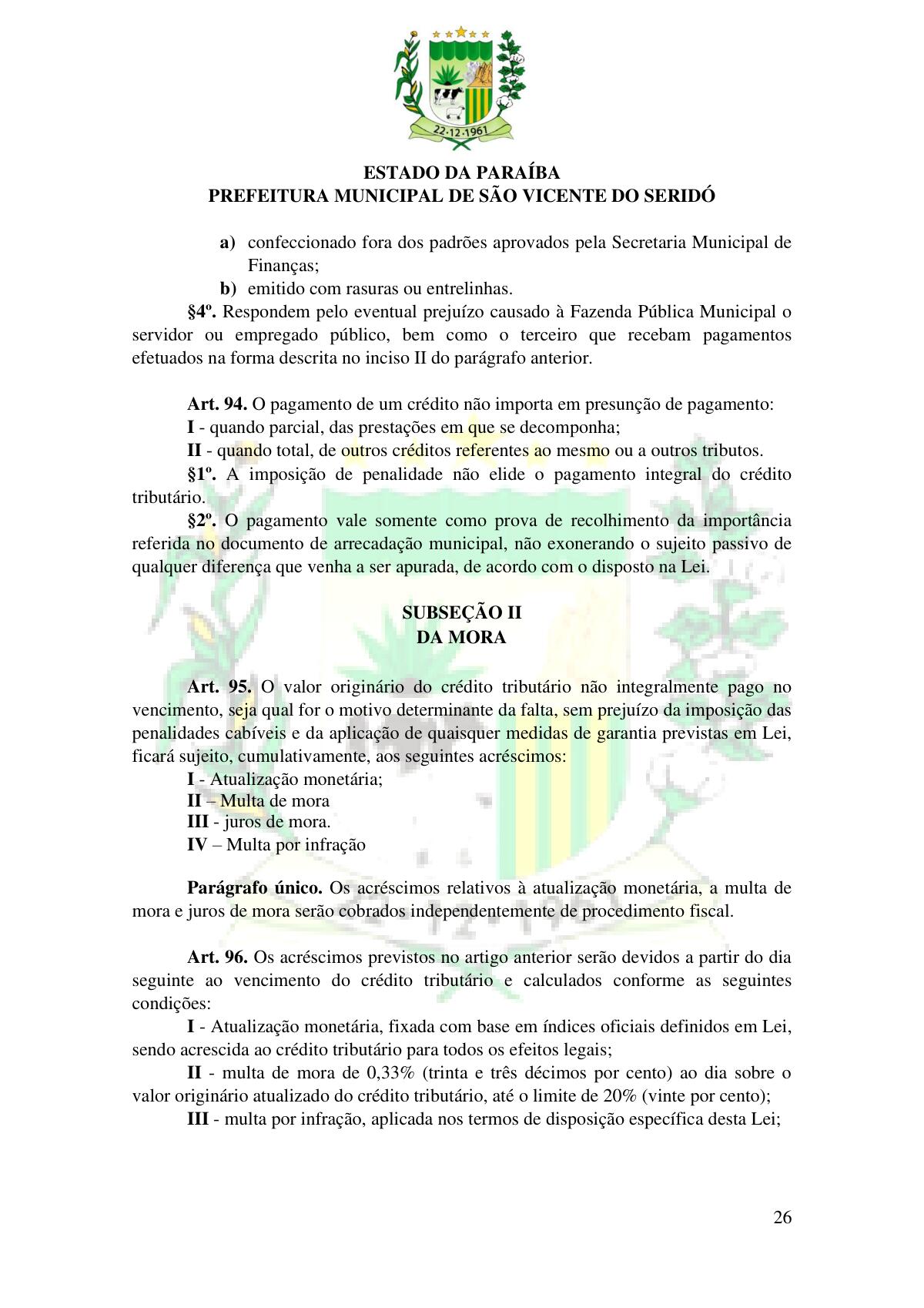 LEI Nº 230/2023 - REVOGA A LEI COMPLEMENTAR Nº 012/1996 E CRIA O NOVO CÓDIGO TRIBUTÁRIO E DE RENDAS DO MUNICÍPIO DE SÃO VICENTE DO SERIDÓ - PB E DÁ OUTRAS PROVIDÊNCIAS.