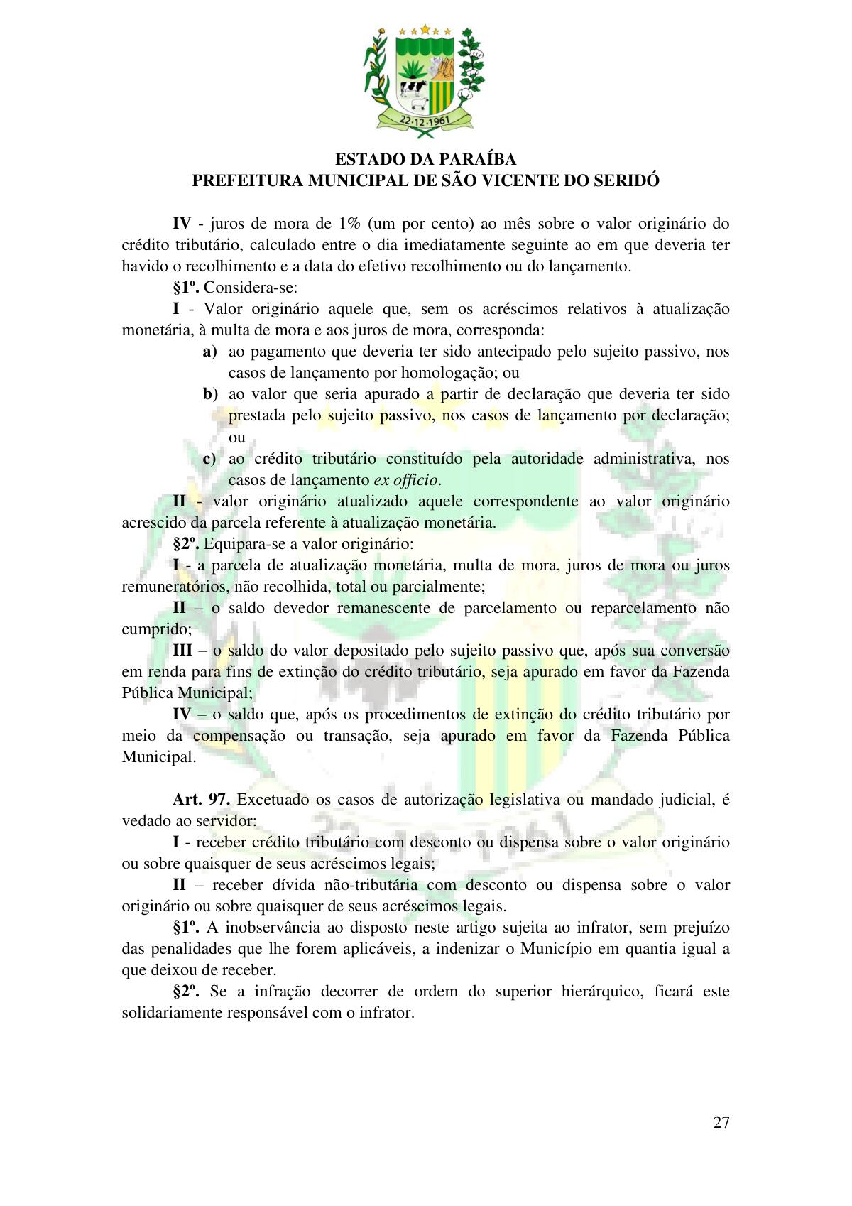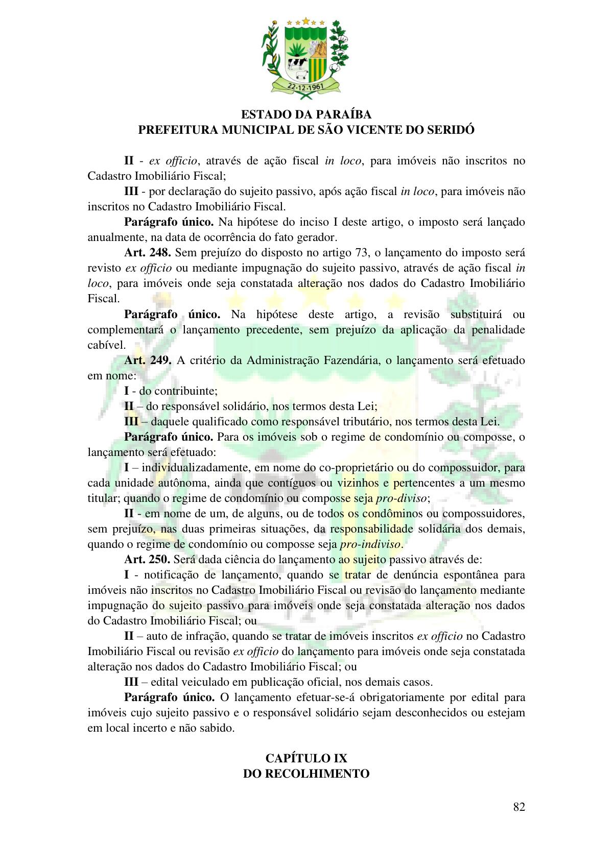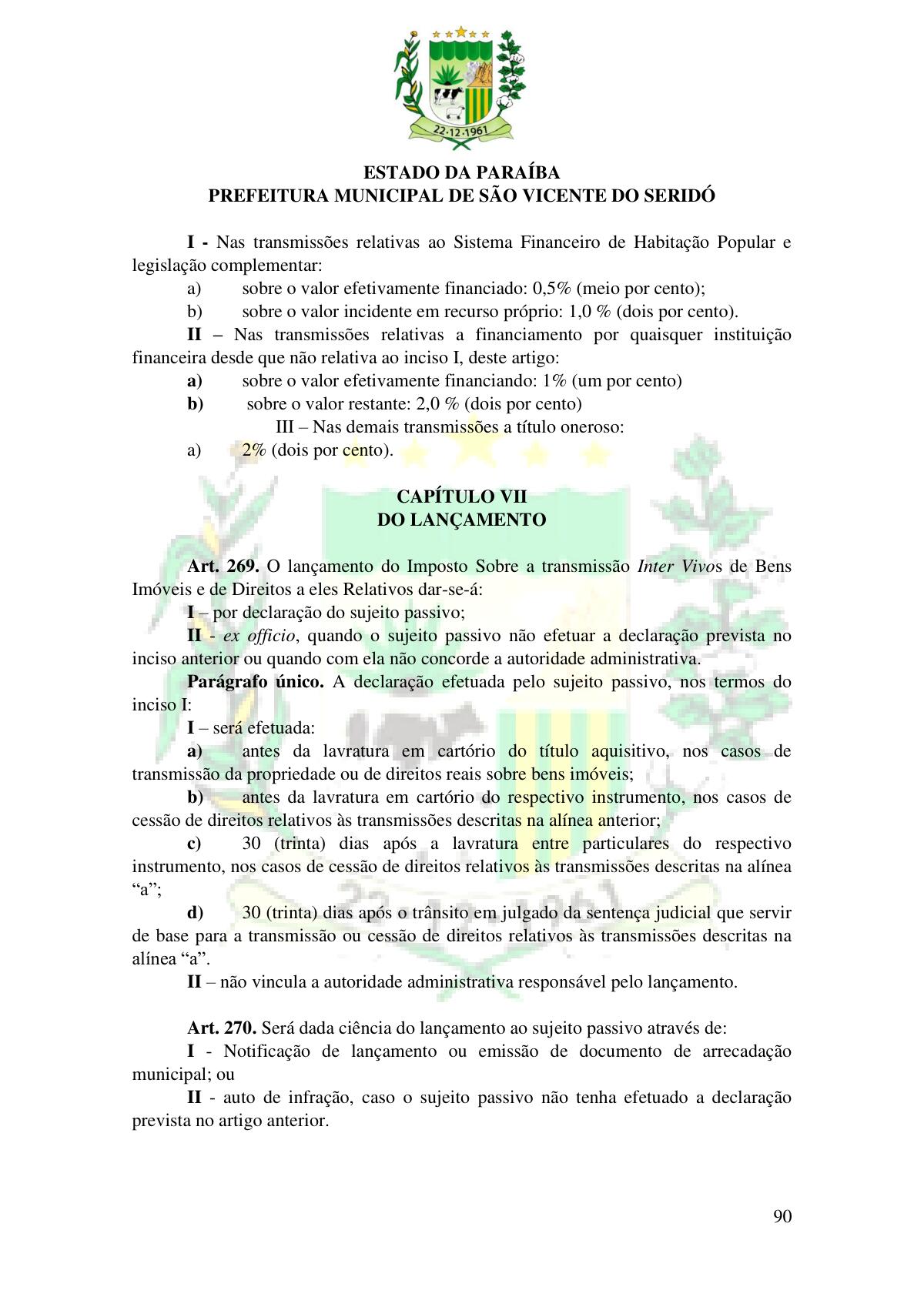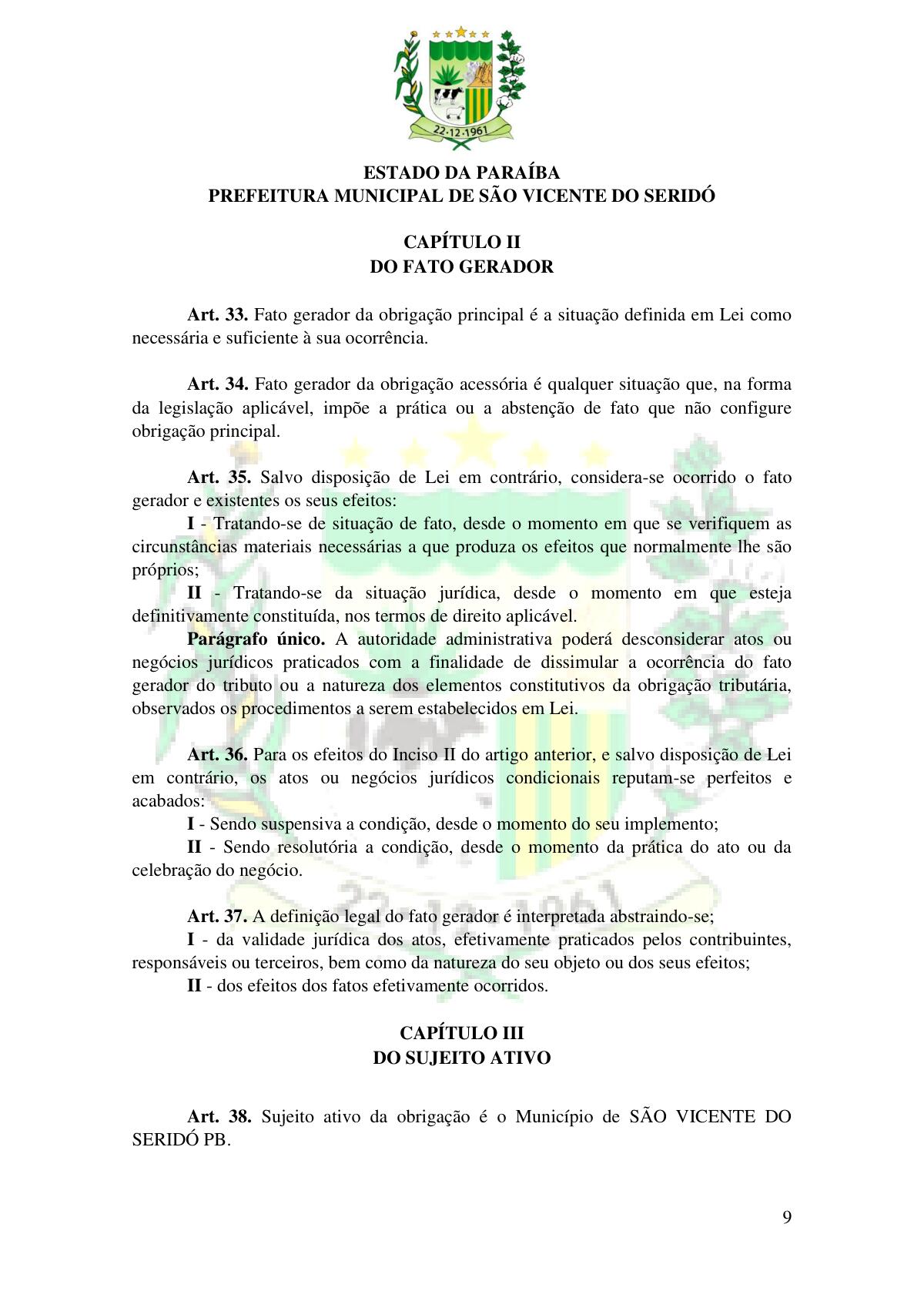 LEI Nº 230/2023 - REVOGA A LEI COMPLEMENTAR Nº 012/1996 E CRIA O NOVO CÓDIGO TRIBUTÁRIO E DE RENDAS DO MUNICÍPIO DE SÃO VICENTE DO SERIDÓ - PB E DÁ OUTRAS PROVIDÊNCIAS.