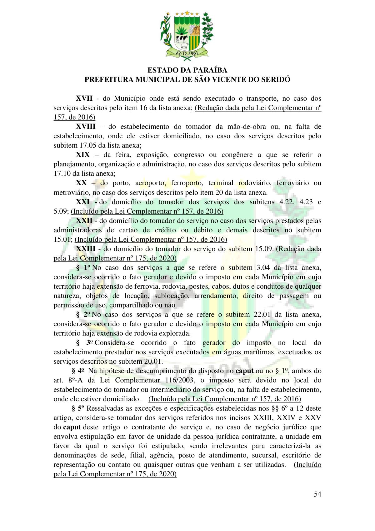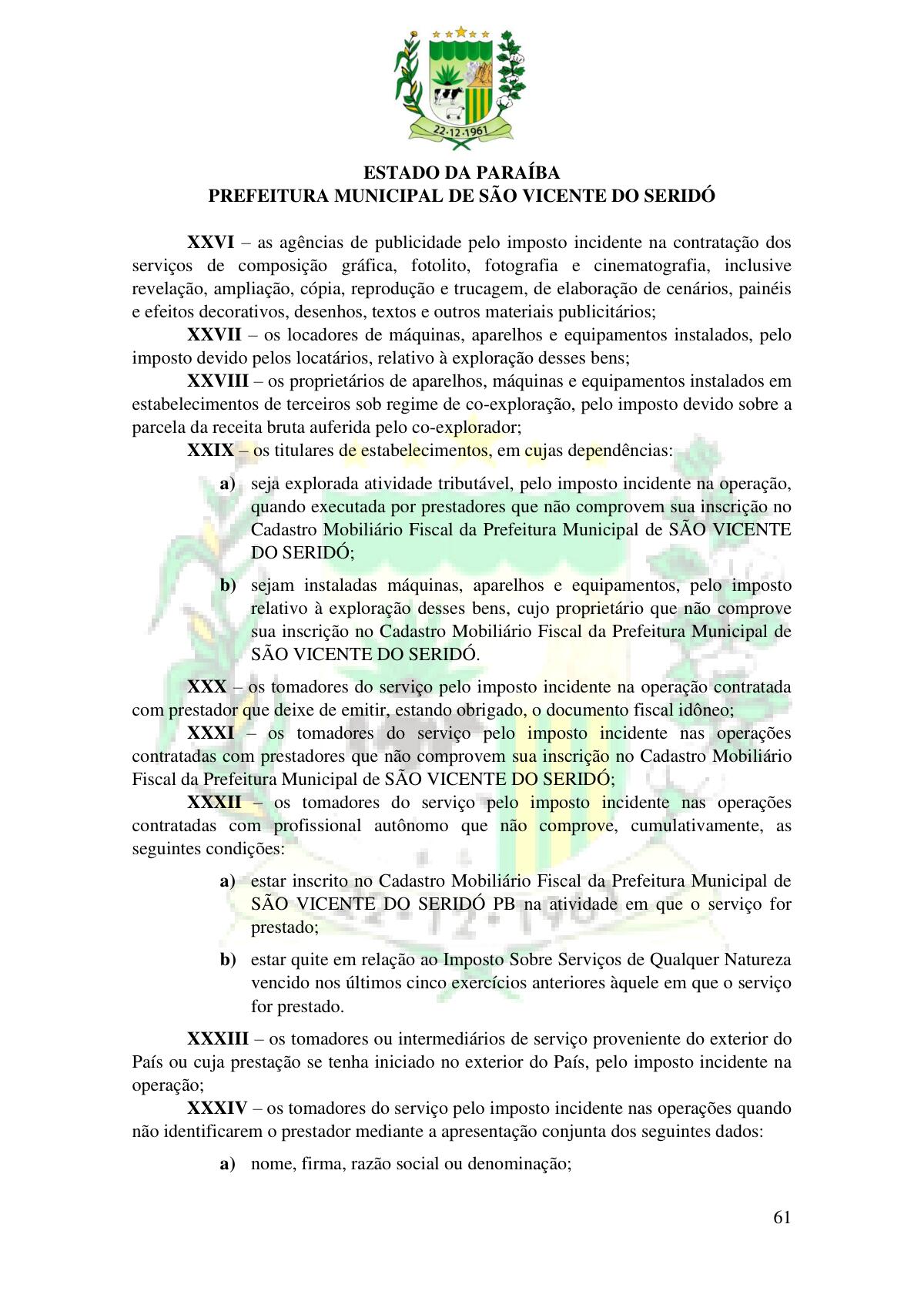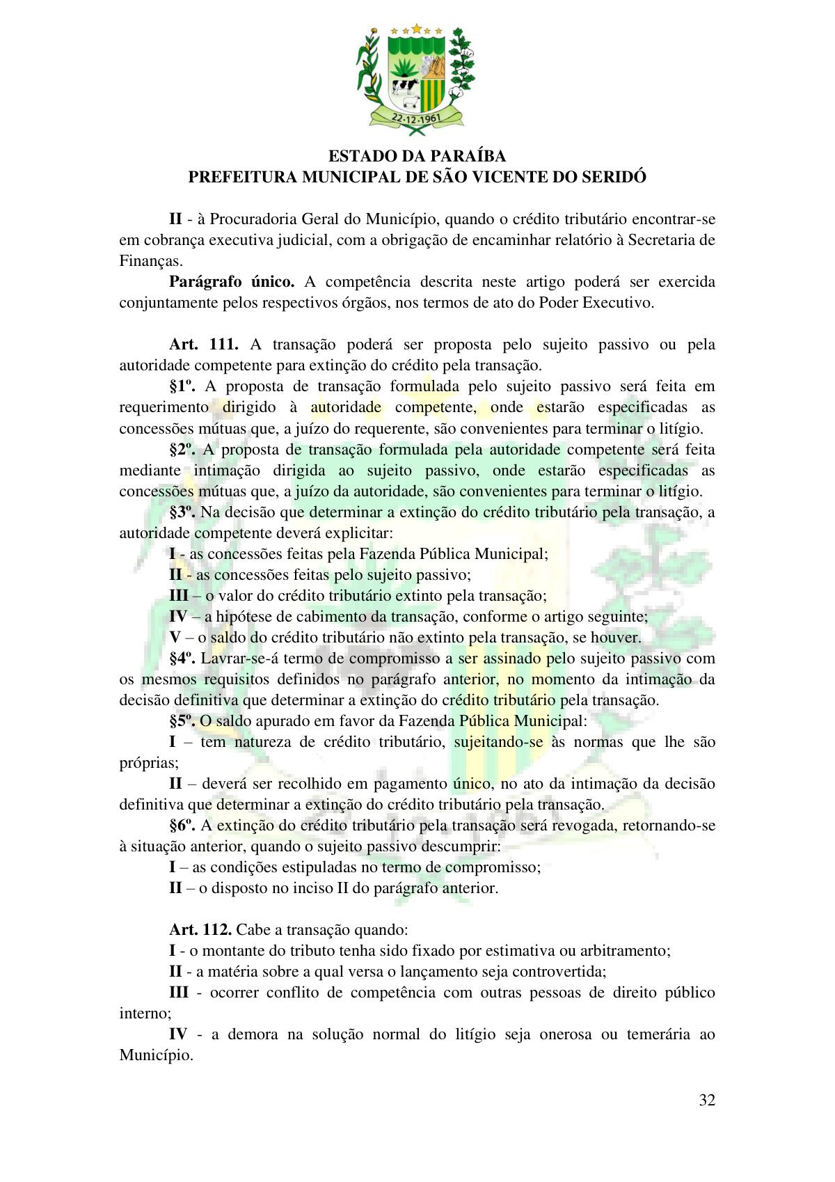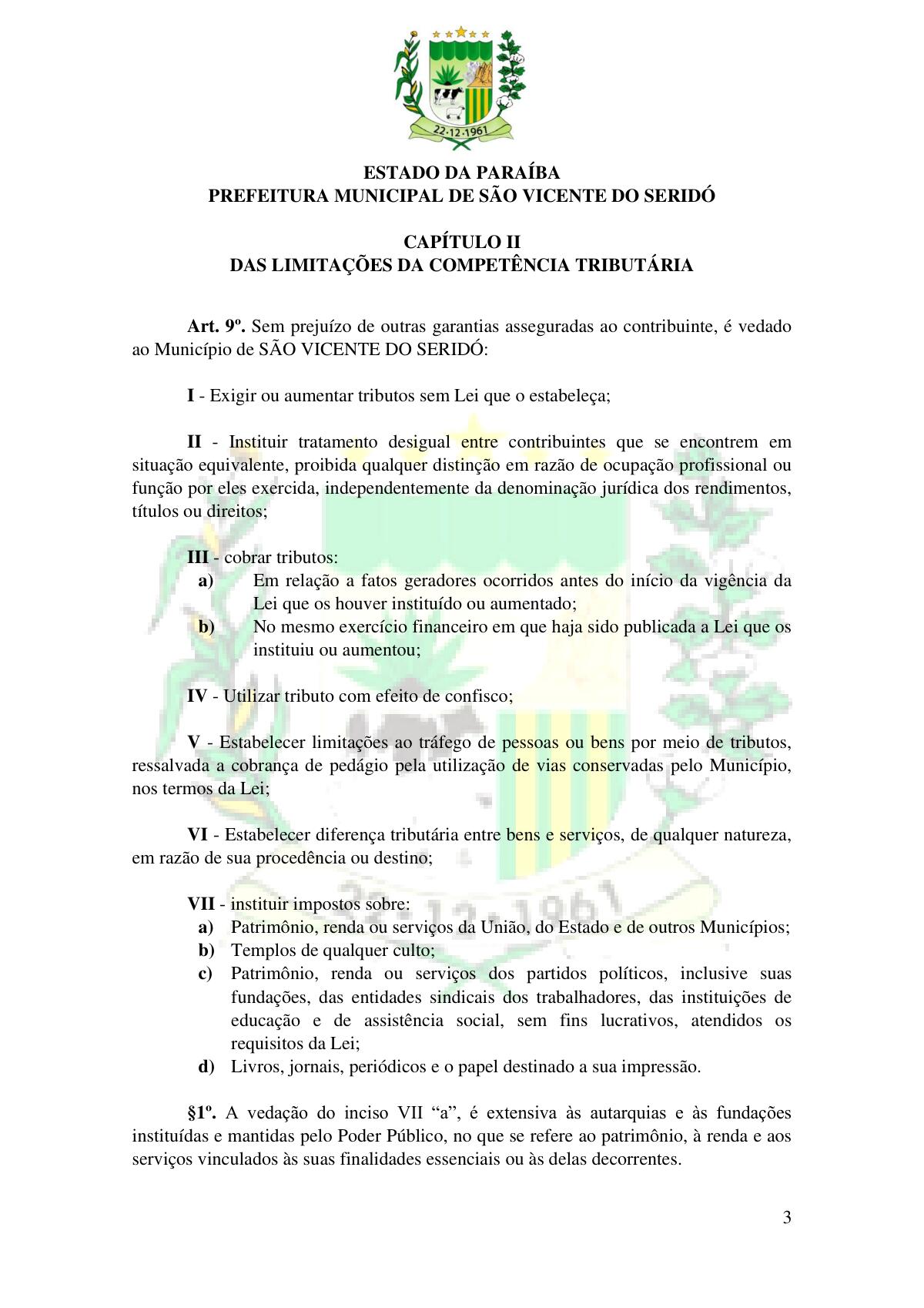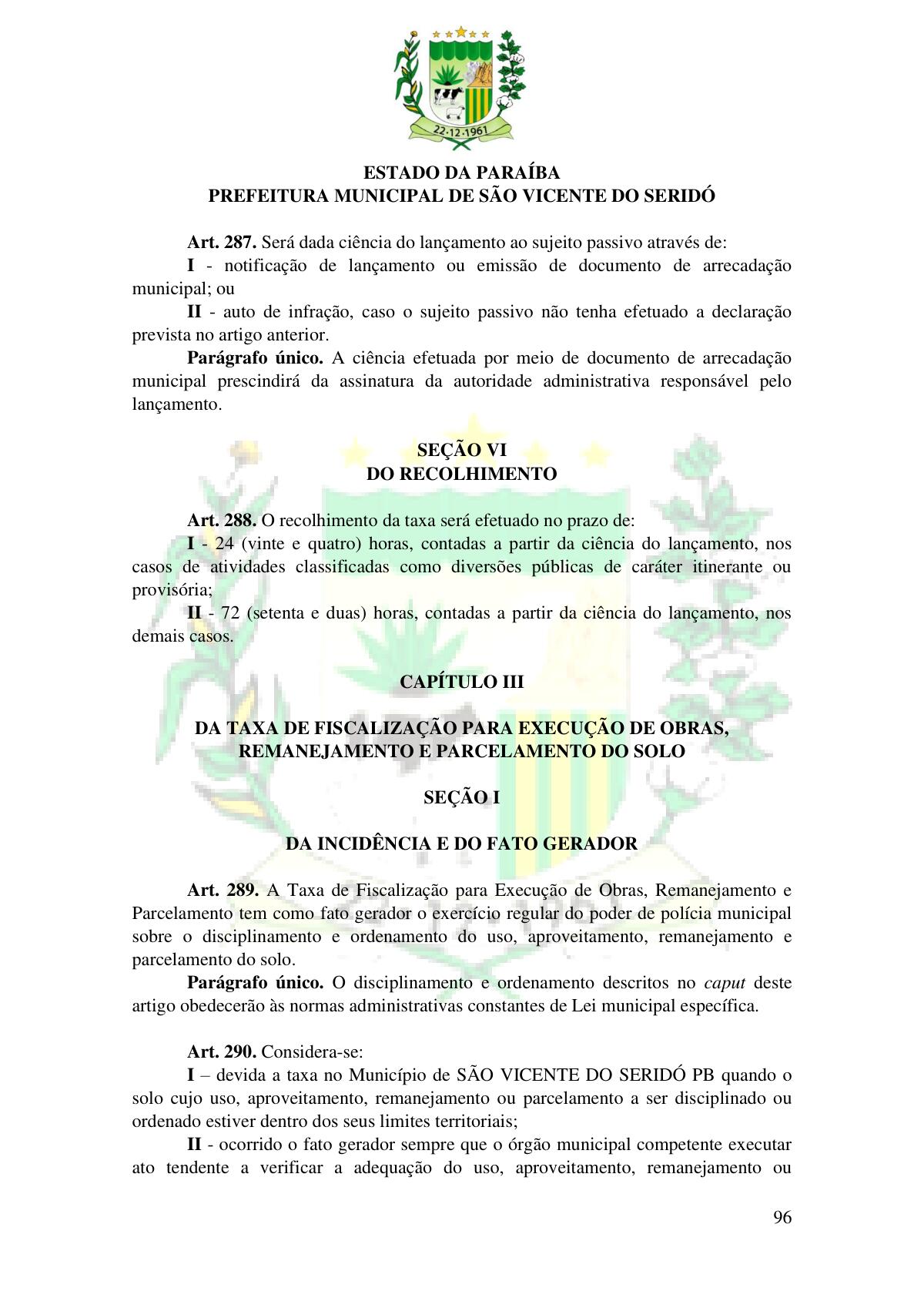 LEI Nº 230/2023 - REVOGA A LEI COMPLEMENTAR Nº 012/1996 E CRIA O NOVO CÓDIGO TRIBUTÁRIO E DE RENDAS DO MUNICÍPIO DE SÃO VICENTE DO SERIDÓ - PB E DÁ OUTRAS PROVIDÊNCIAS.