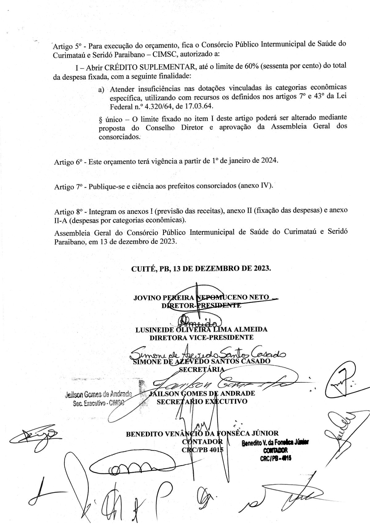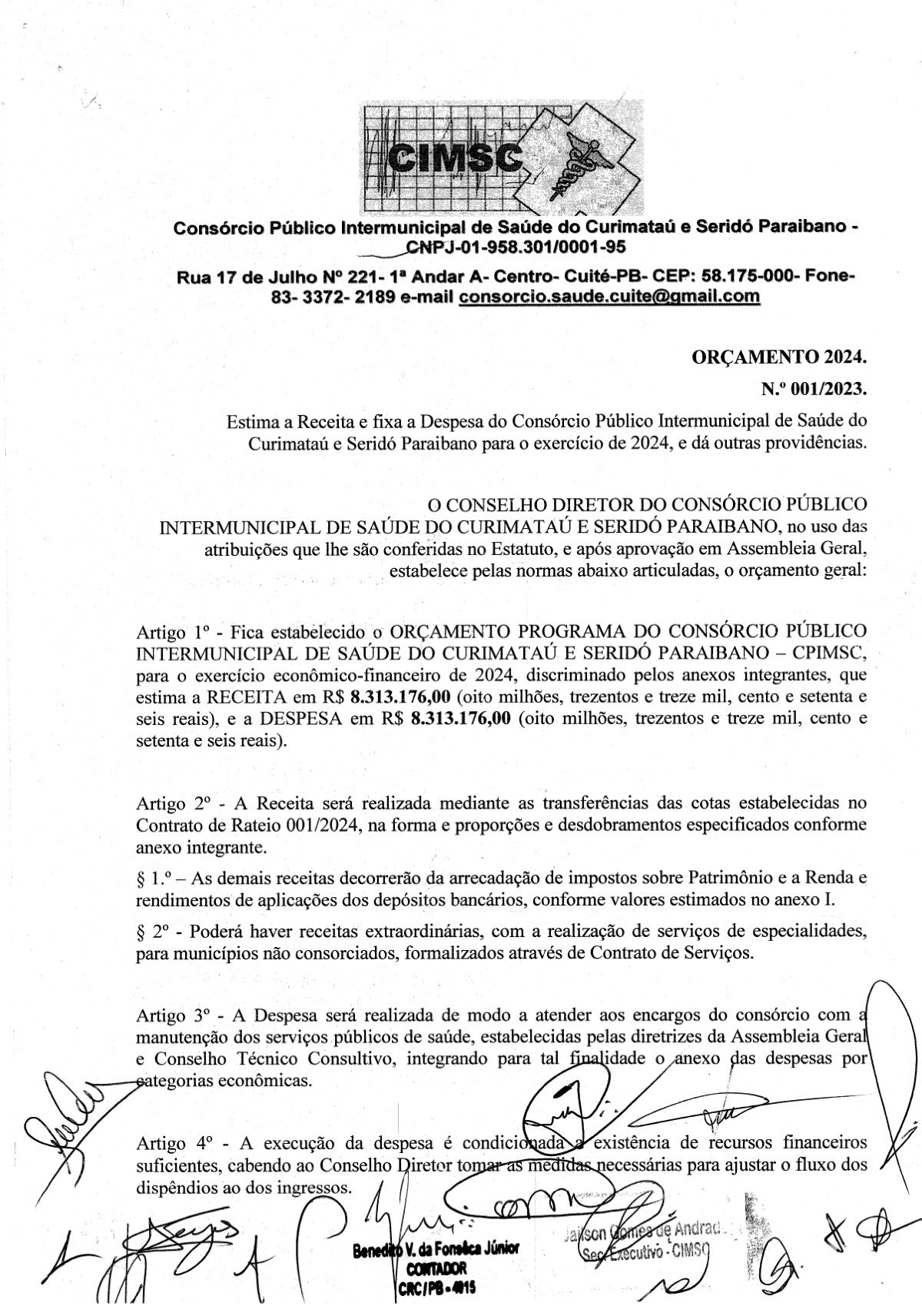 ORÇAMENTO 2024 - ESTIMA A RECEITA E FIXA A DESPESA DO CONSÓRCIO PÚBLICO INTERMUNICIPAL DE SAÚDE DO CURIMATAÚ E SERIDÓ PARAIBANO