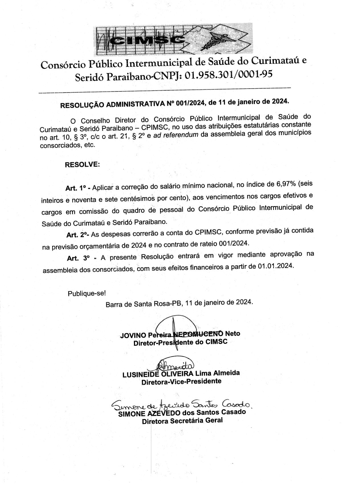 RESOLUÇÃO ADMINISTRATIVA N° 0001/2024