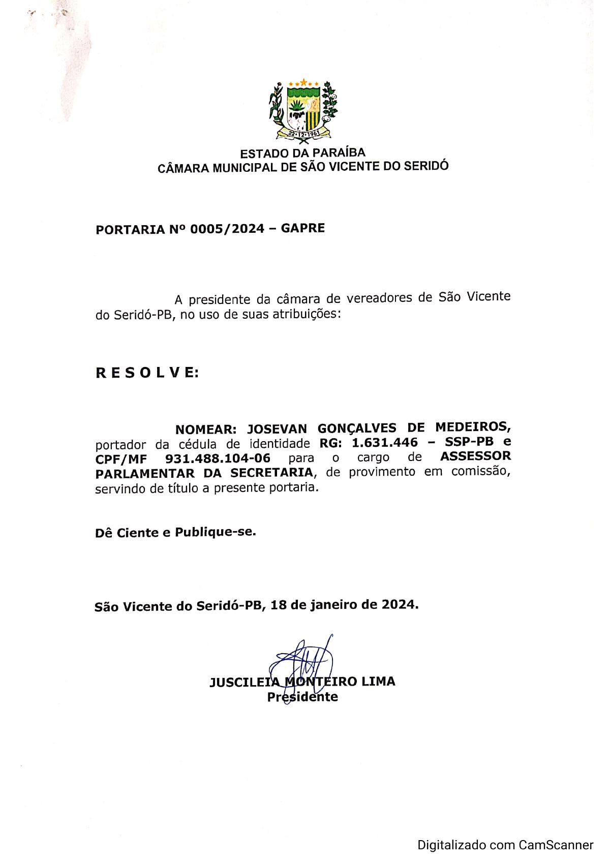 PORTARIA N° 0005/2024 - NOMEAÇÃO DE JOSEVAN GONÇALVES DE MEDEIROS