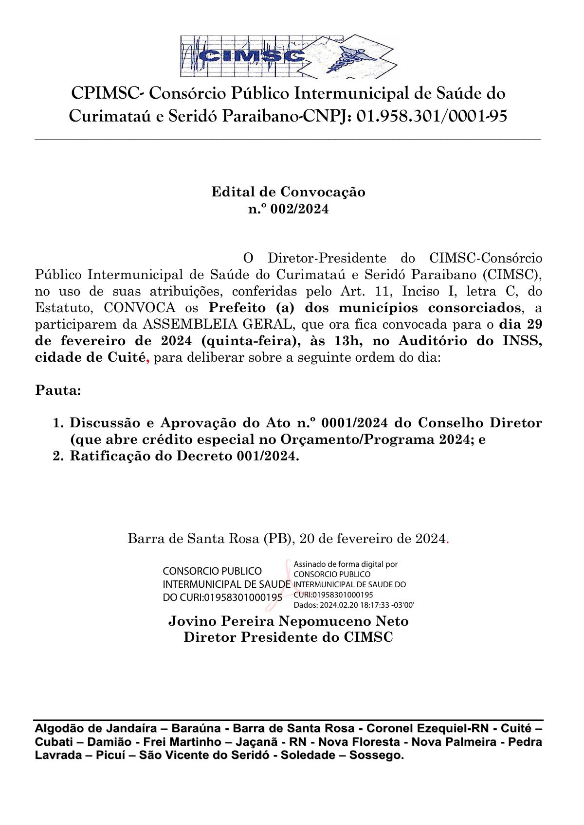EDITAL DE CONVOCAÇÃO N° 0002/2024