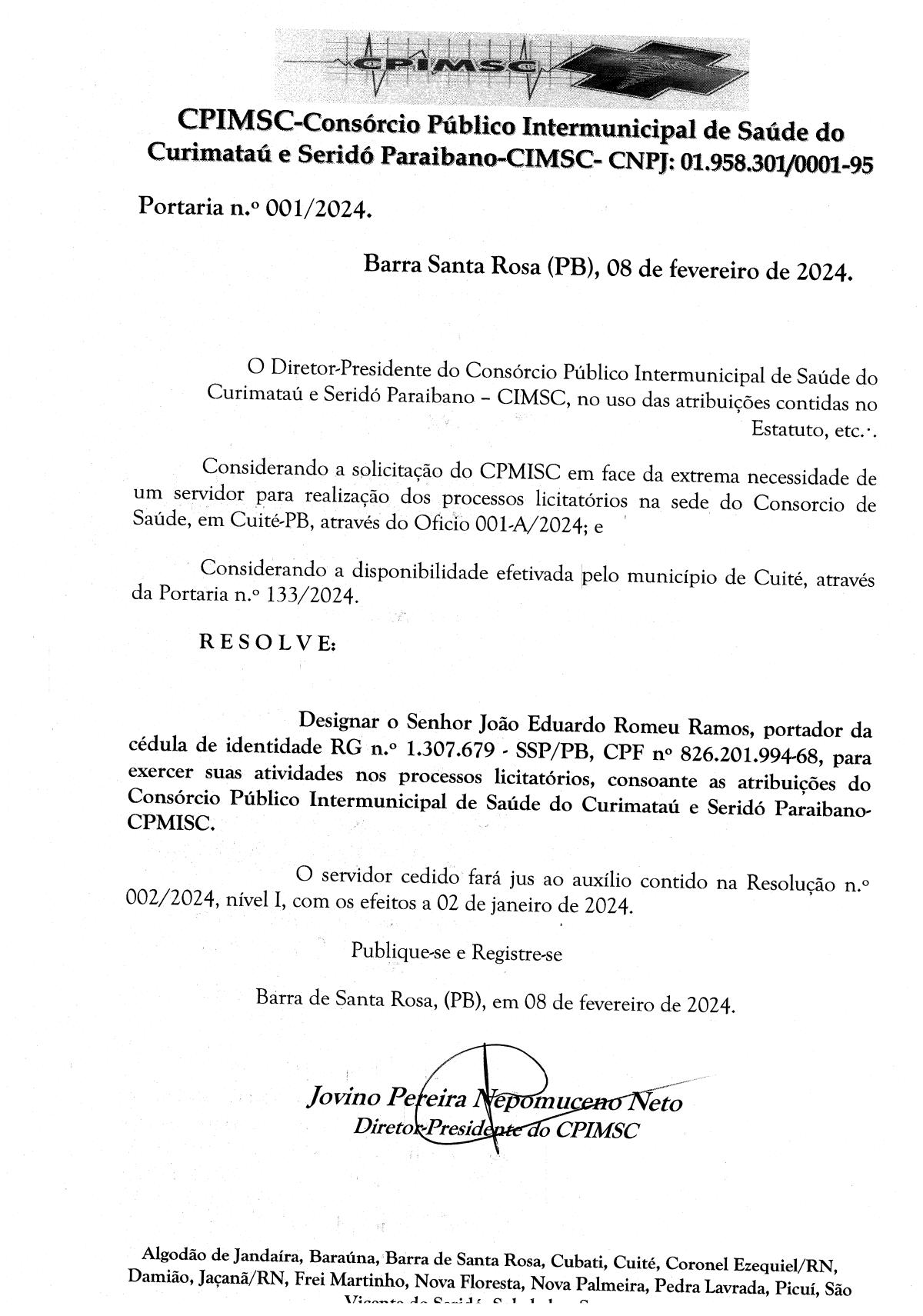 PORTARIA N° 0001/2024 - DESEGNAR O SENHOR JOÃO EDUARDO ROMEU RAMOS