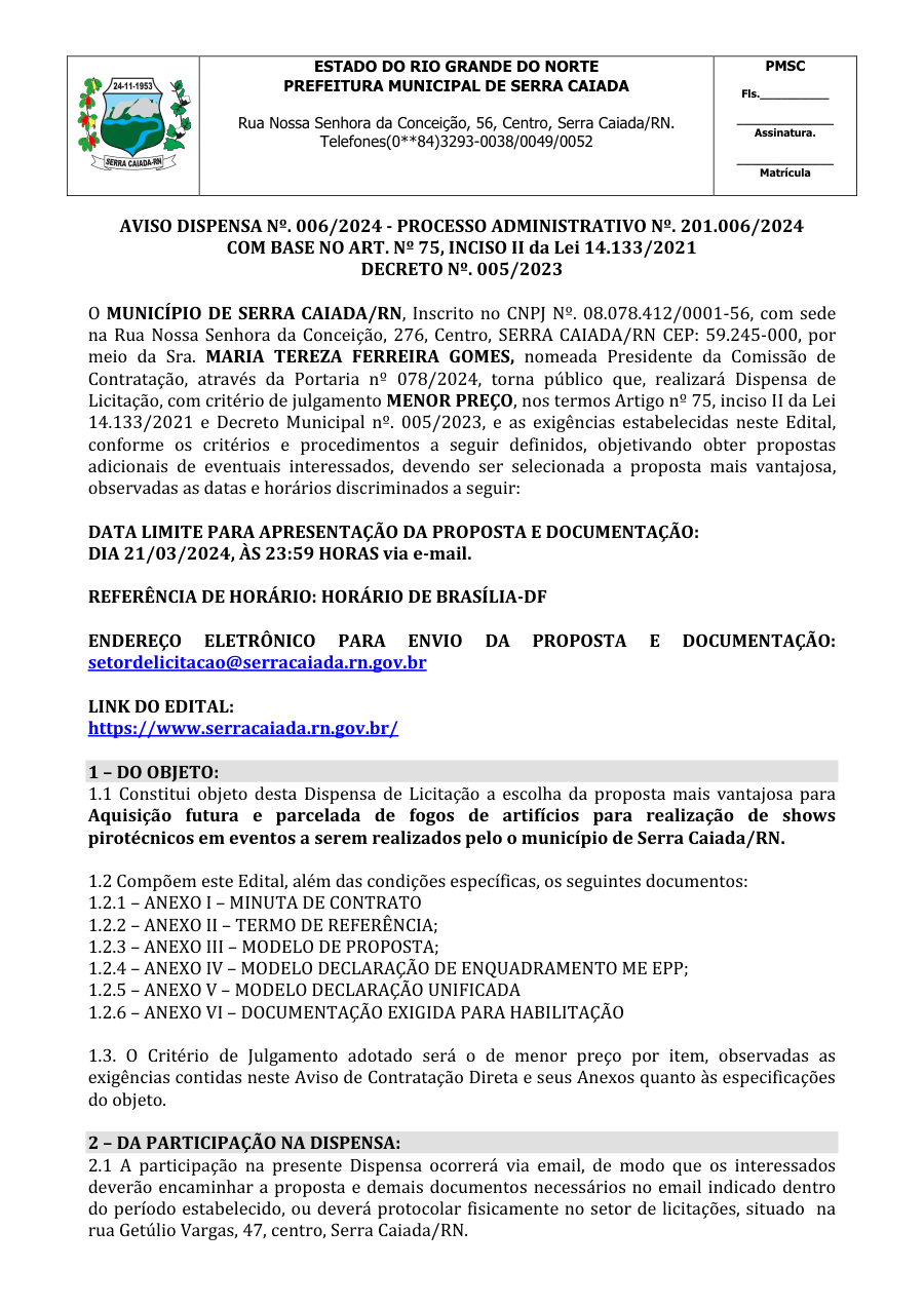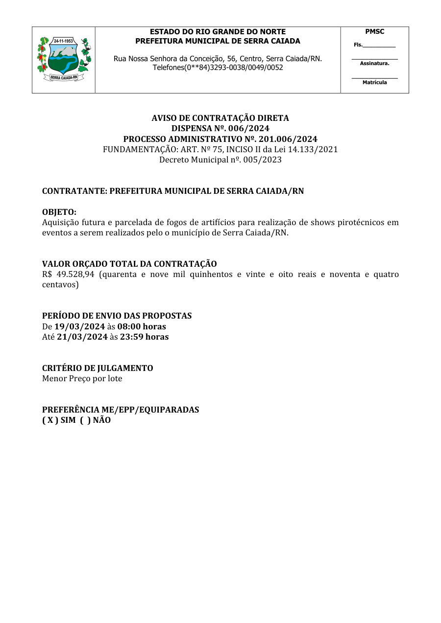 AVISO DE CONTRATAÇÃO DIRETA DISPENSA Nº. 006/2024 PROCESSO ADMINISTRATIVO Nº. 201.006/2024 FUNDAMENTAÇÃO: ART. Nº 75, INCISO II DA LEI 14.133/2021 DECRETO MUNICIPAL Nº. 005/2023