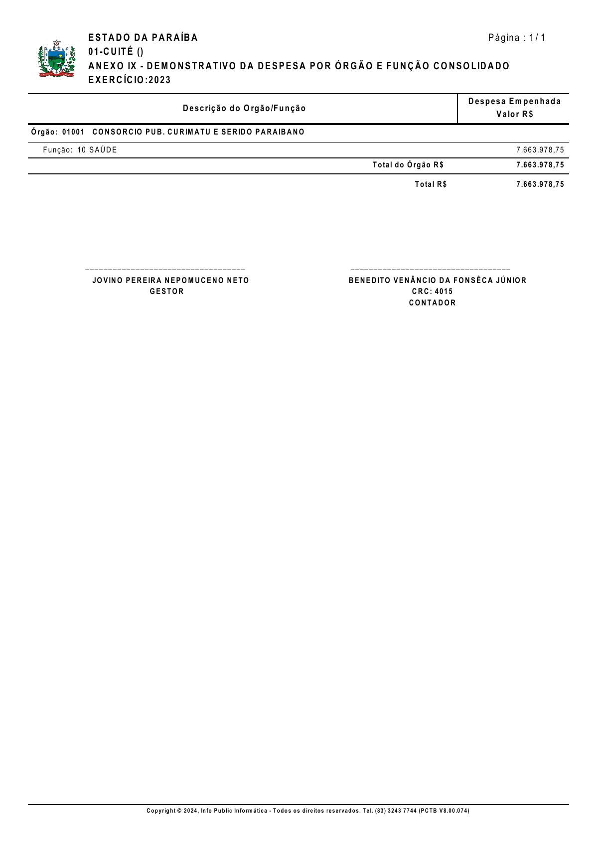 ANECO IX - DEMONSTRATIVO DA DESPESA POR ÓRGÃO E FUNÇÃO CONSOLIDADO - EXERCÍCIO 2023