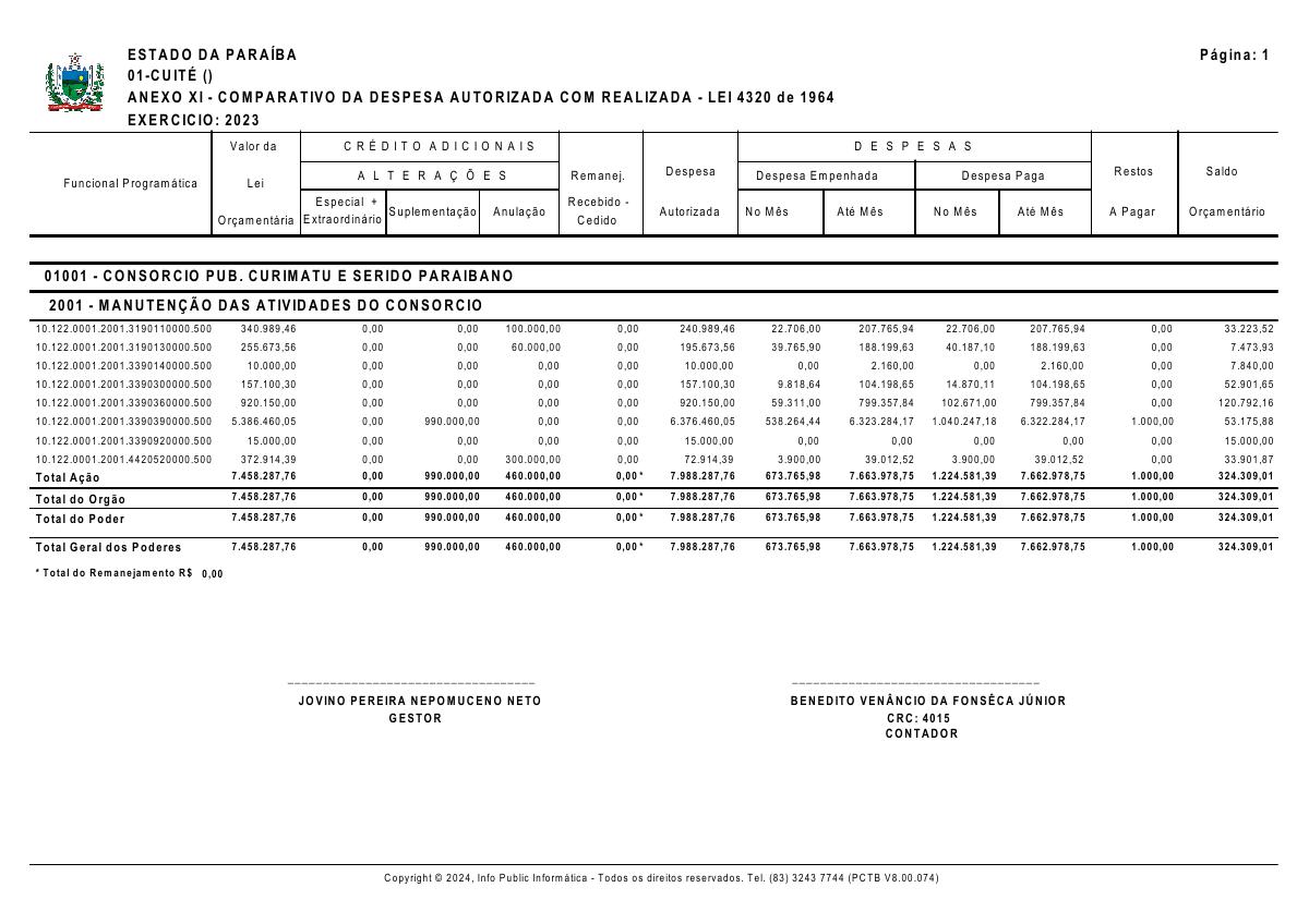 ANEXO XI - COMPARATIVO DA DESPESA AUTORIZADA COM REALIZADA - LEI 4320 DE 1964