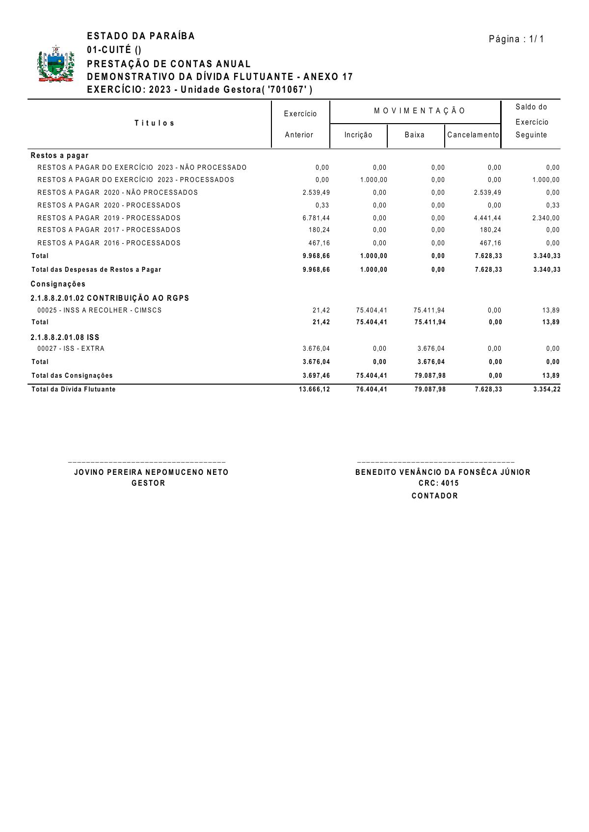 DEMONSTRATIVO DA DÍVIDA FLUTUANTE - ANEXO 17 - EXERCÍCIO 2023